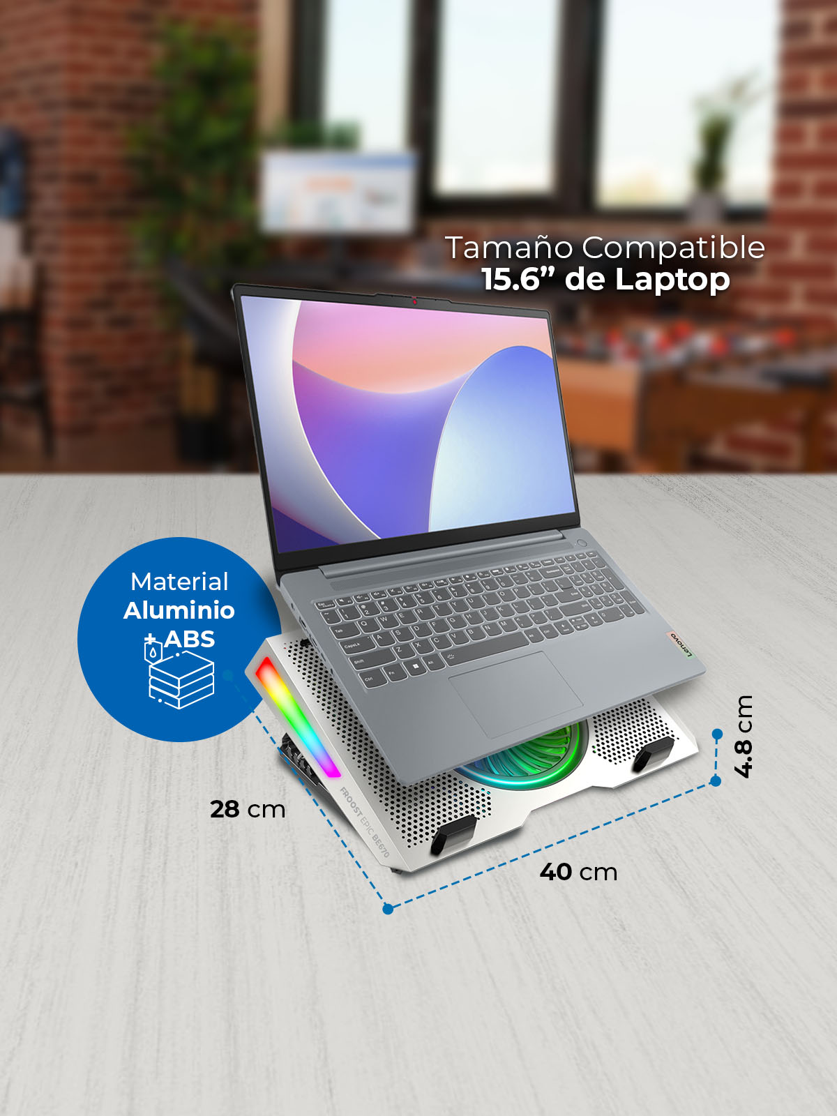 Su diseño en aluminio y ABS asegura resistencia, mientras que su tamaño compacto es ideal para laptops de hasta 15.6”.