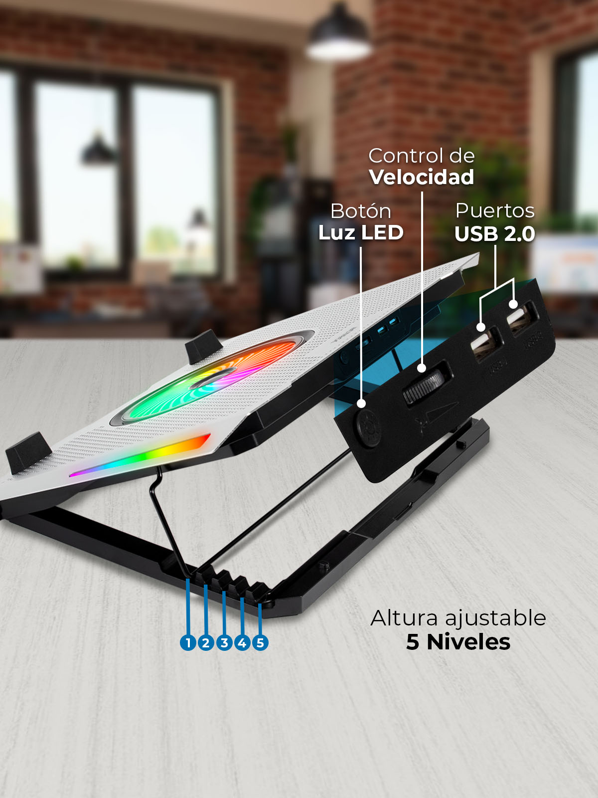 Mantén tu laptop fresca en todo momento con esta base de enfriamiento que combina un ventilador central de 125 mm y 4 ventiladores adicionales de 60 mm. Construida con materiales premium, proporciona 5 niveles de ajuste, RGB personalizable y un diseño compacto para mejorar tu productividad sin comprometer la comodidad.