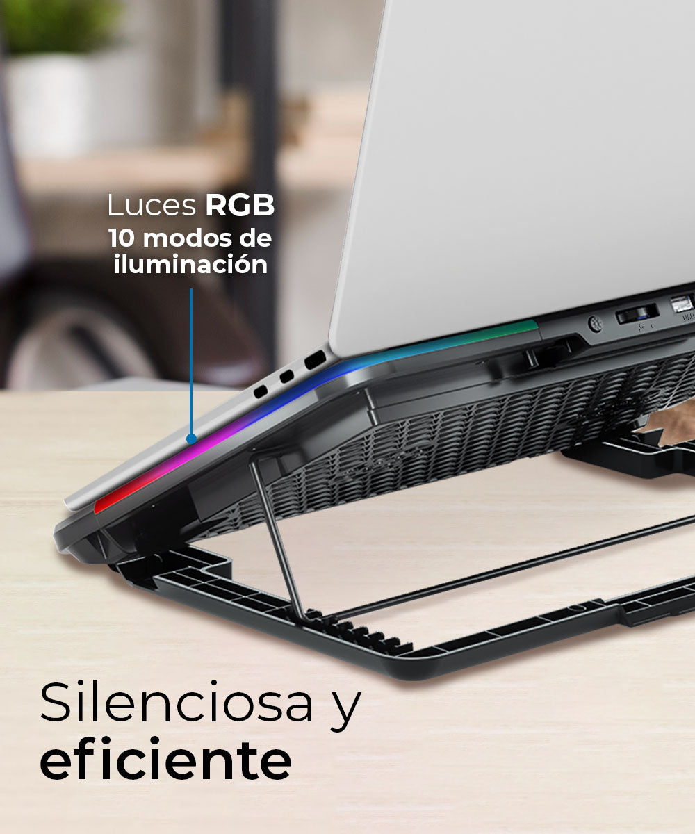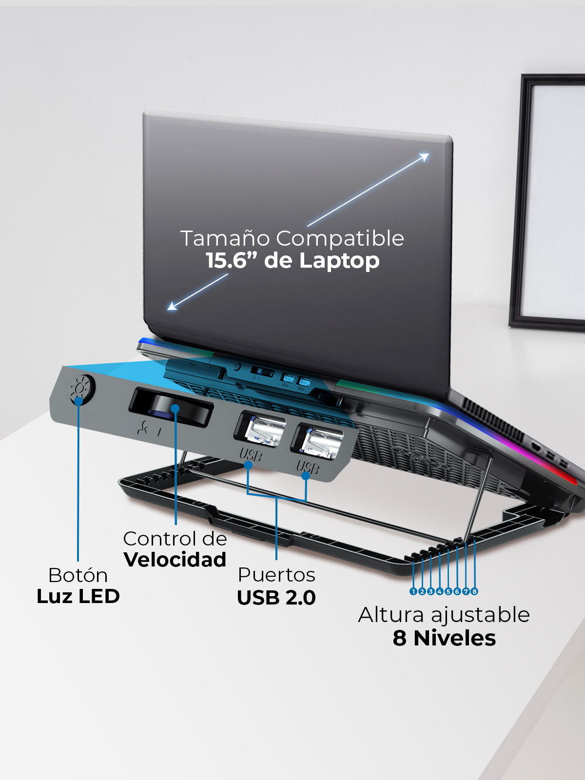 Adapta la altura a tu comodidad con 7 niveles de ajuste. Su diseño en aluminio y ABS asegura resistencia, mientras que su tamaño compacto es ideal para laptops de hasta 15.6”.
