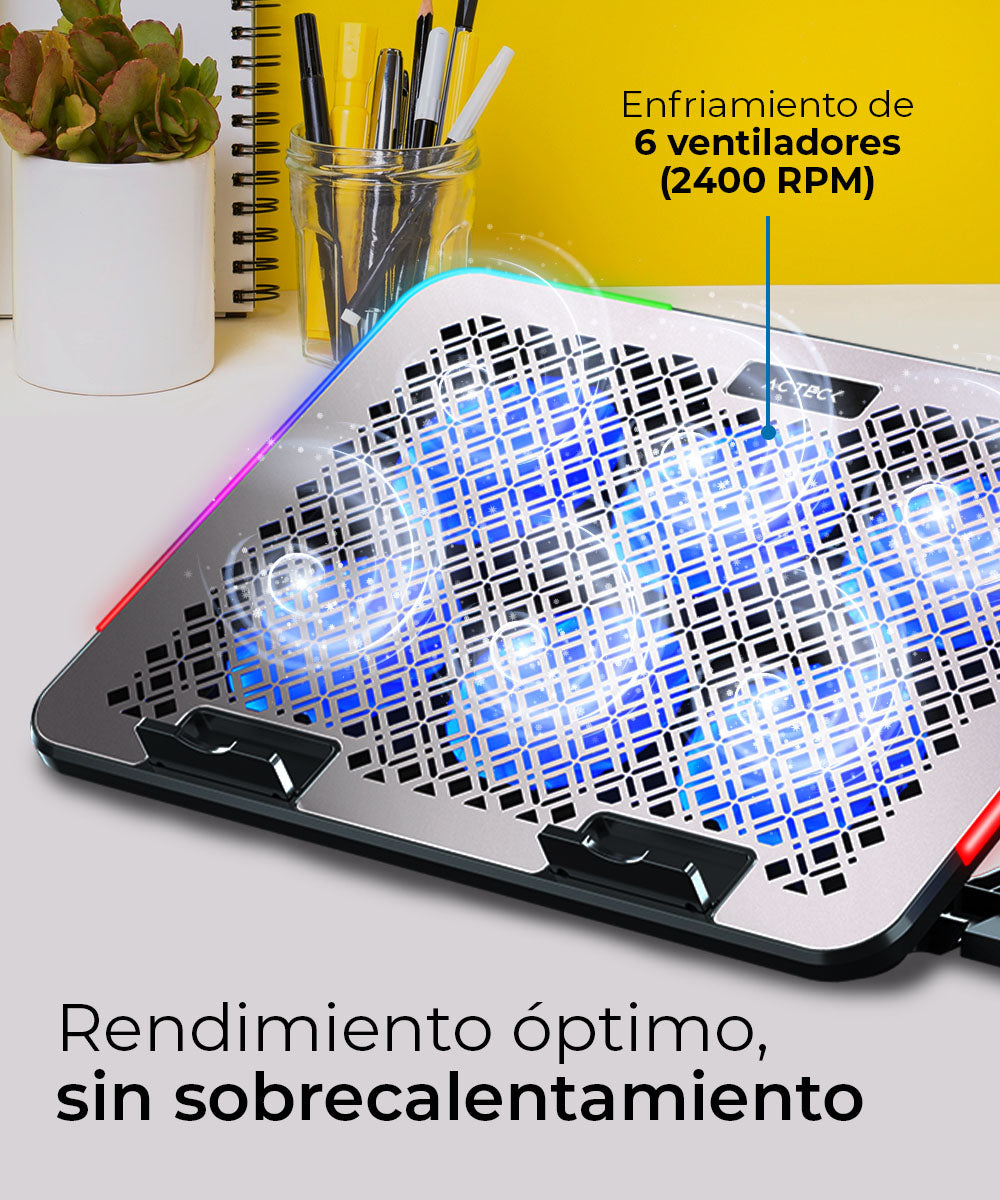 Sus 6 ventiladores de alto rendimiento mantienen tu equipo a una temperatura ideal, permitiéndote trabajar o jugar sin interrupciones por sobrecalentamiento.
