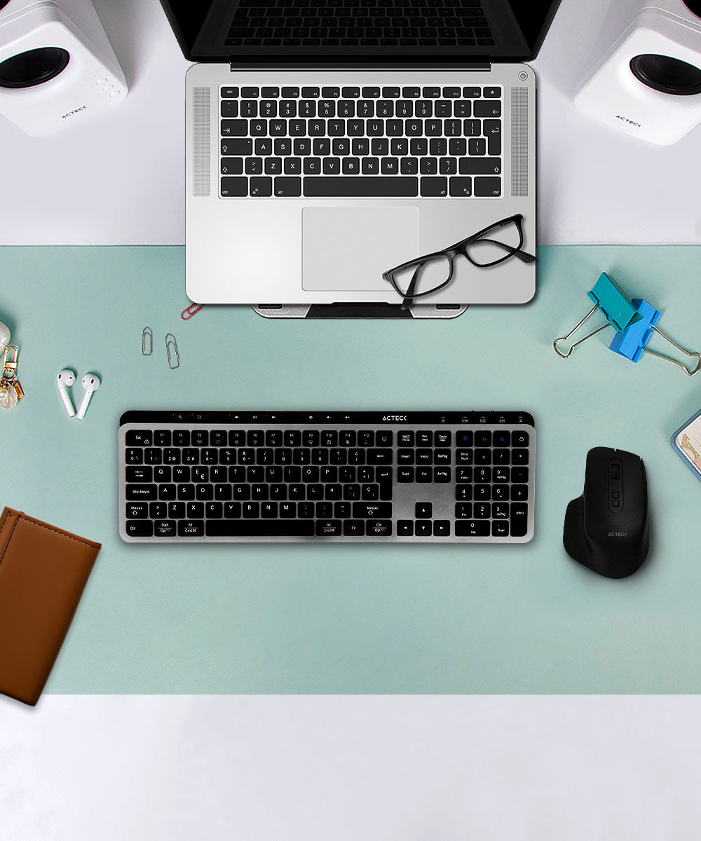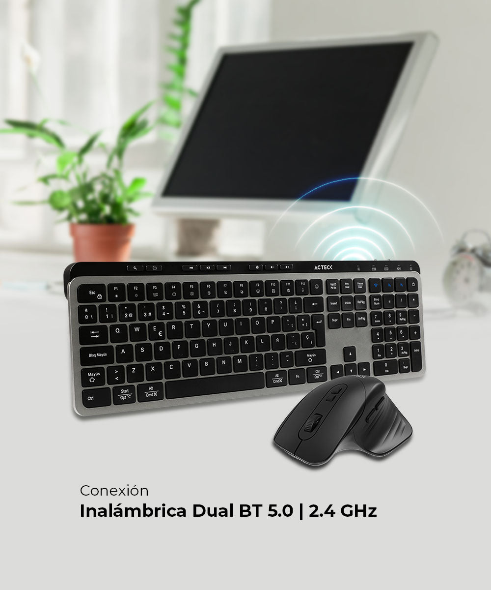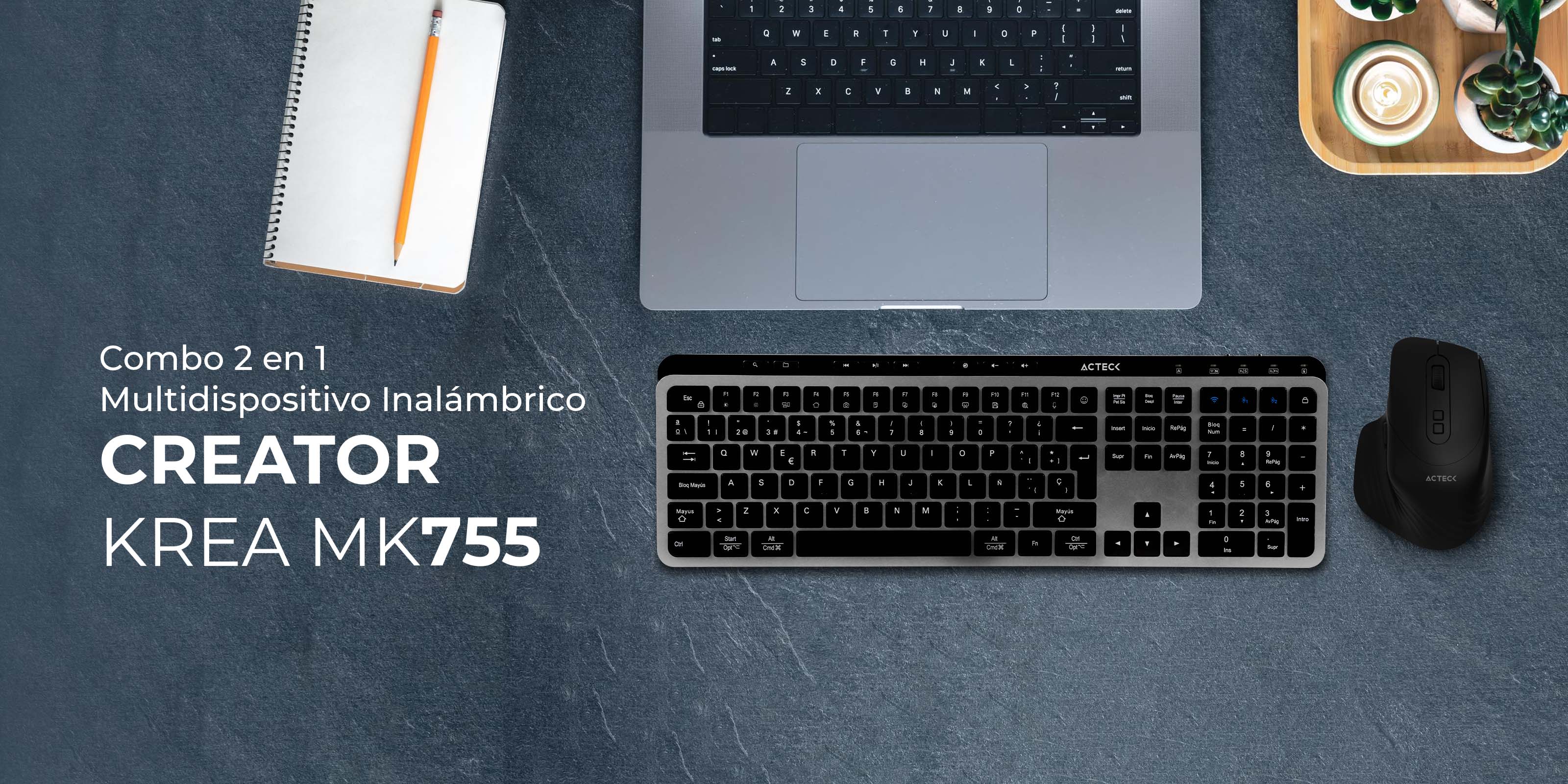 Maximiza tu productividad con el Creator Krea MK755, un combo multidispositivo con teclado 100% y teclas de membrana tipo tijera que garantizan comodidad en cada pulsación. Su mouse ligero, conectividad dual (2.4 GHz + 2 modos BT) y batería recargable lo convierten en la solución perfecta para quienes buscan eficiencia y portabilidad en un diseño sobrio y elegante.