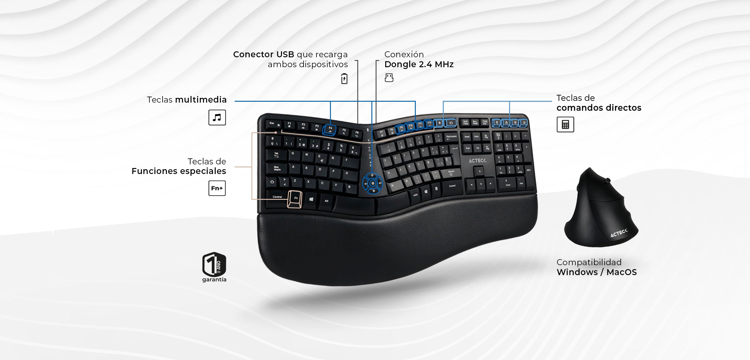 Con conectividad inalámbrica de 2.4 GHz, tanto el teclado como el mouse ofrecen una libertad de movimiento sin igual. El teclado ergonómico asegura una postura cómoda mientras escribes, mientras que el mouse vertical reduce la tensión en la muñeca. Ambos dispositivos se recargan fácilmente mediante USB C, asegurando un rendimiento duradero y sin complicaciones.