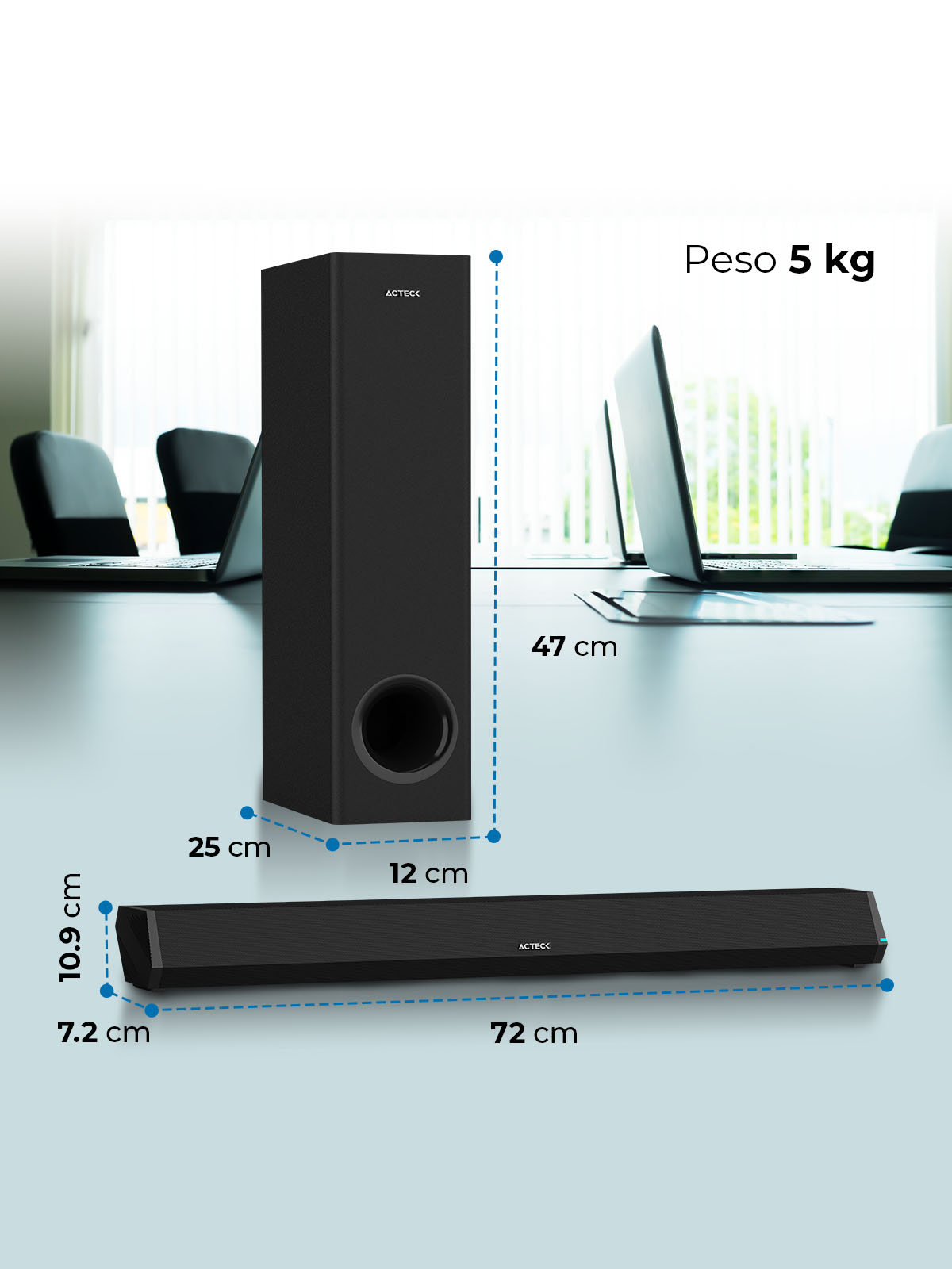 Con dimensiones de 12 x 47 x 25 cm para el subwoofer y 72 x 10.9 x 7.2 cm para la barra de sonido, este sistema compacto y elegante está diseñado para encajar perfectamente en cualquier espacio, sin sacrificar potencia. Con un peso de 5 kg, ofrece estabilidad y un rendimiento acústico sobresaliente en un formato estilizado.