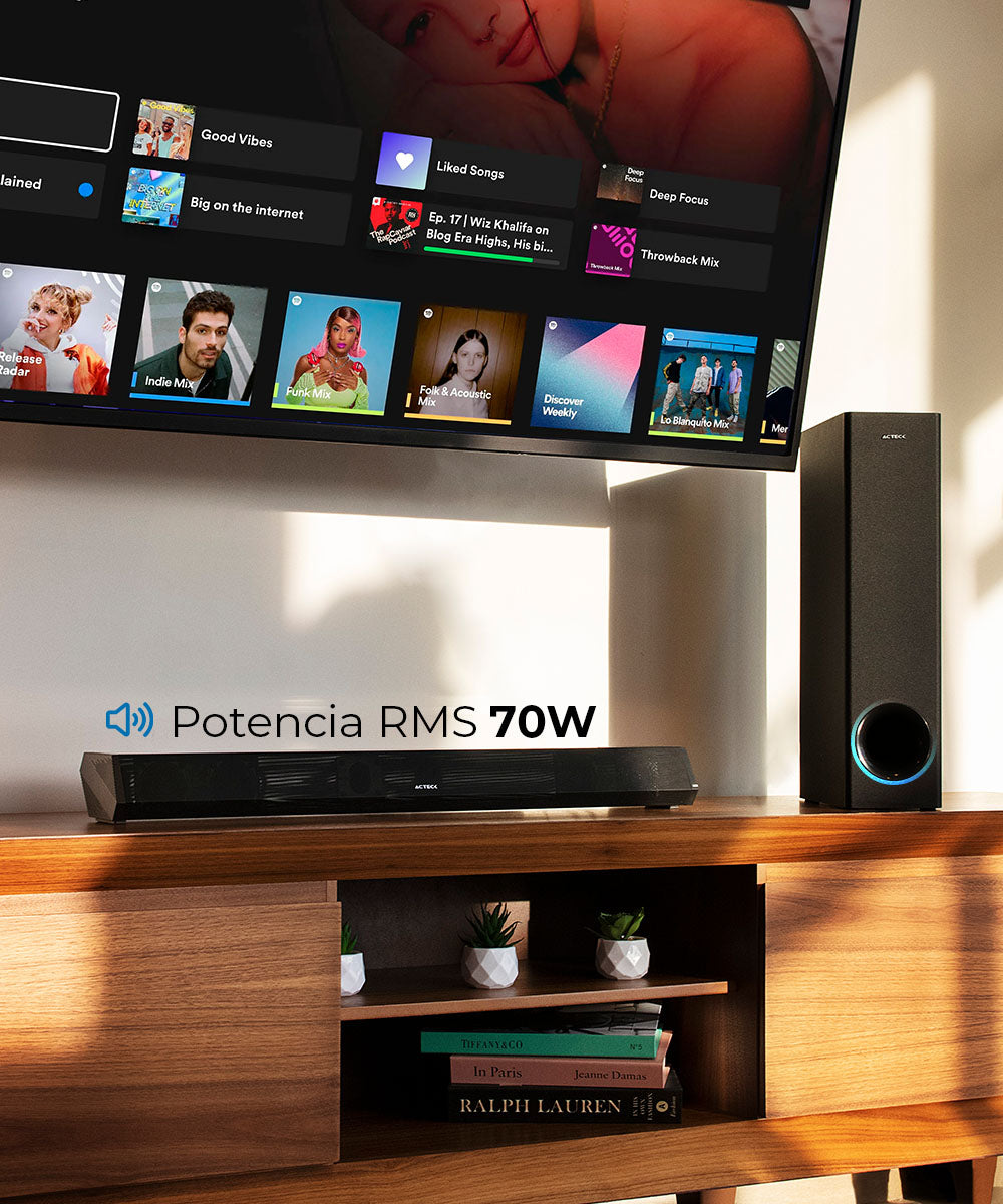 Cuenta con una potencia de salida de 70W, lo que asegura un sonido envolvente y potente que llena la habitación con una experiencia de audio inigualable.