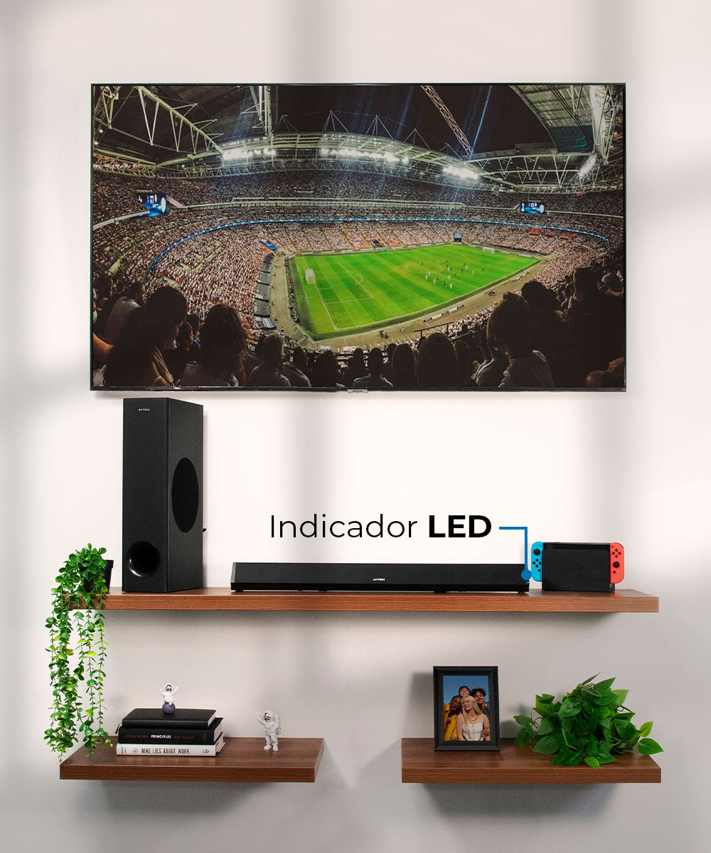 La barra de sonido incorpora un indicador LED que muestra el estado y las funciones activas de manera clara y sencilla. Con solo un vistazo, podrás ver el modo de conexión o el volumen, brindando un control más intuitivo y moderno para mejorar tu experiencia de audio.