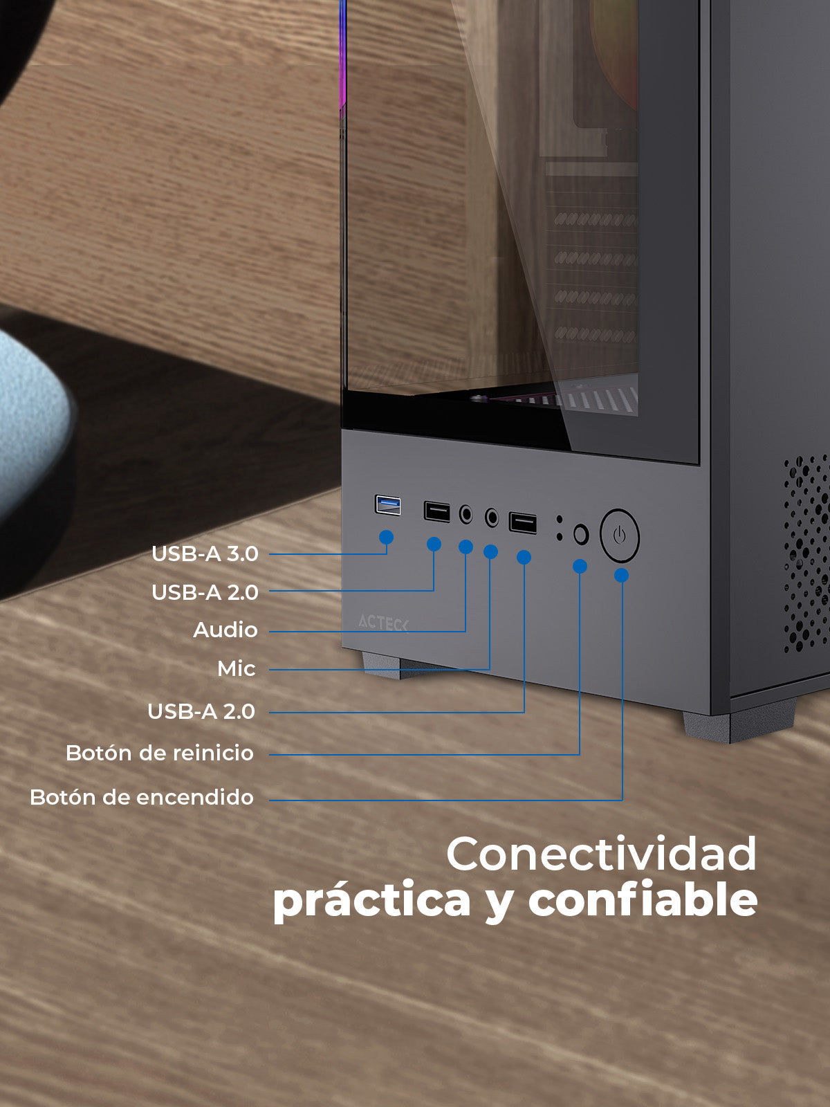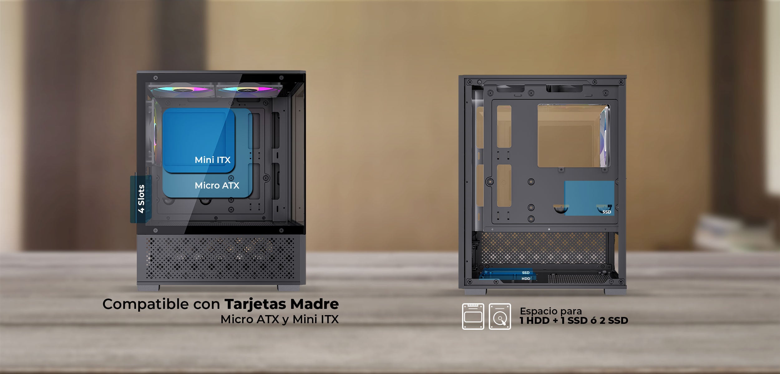 Con 4 slots expandibles y bahías para unidades SSD y HDD, este gabinete permite ampliar almacenamiento y desempeño, garantizando orden y productividad.