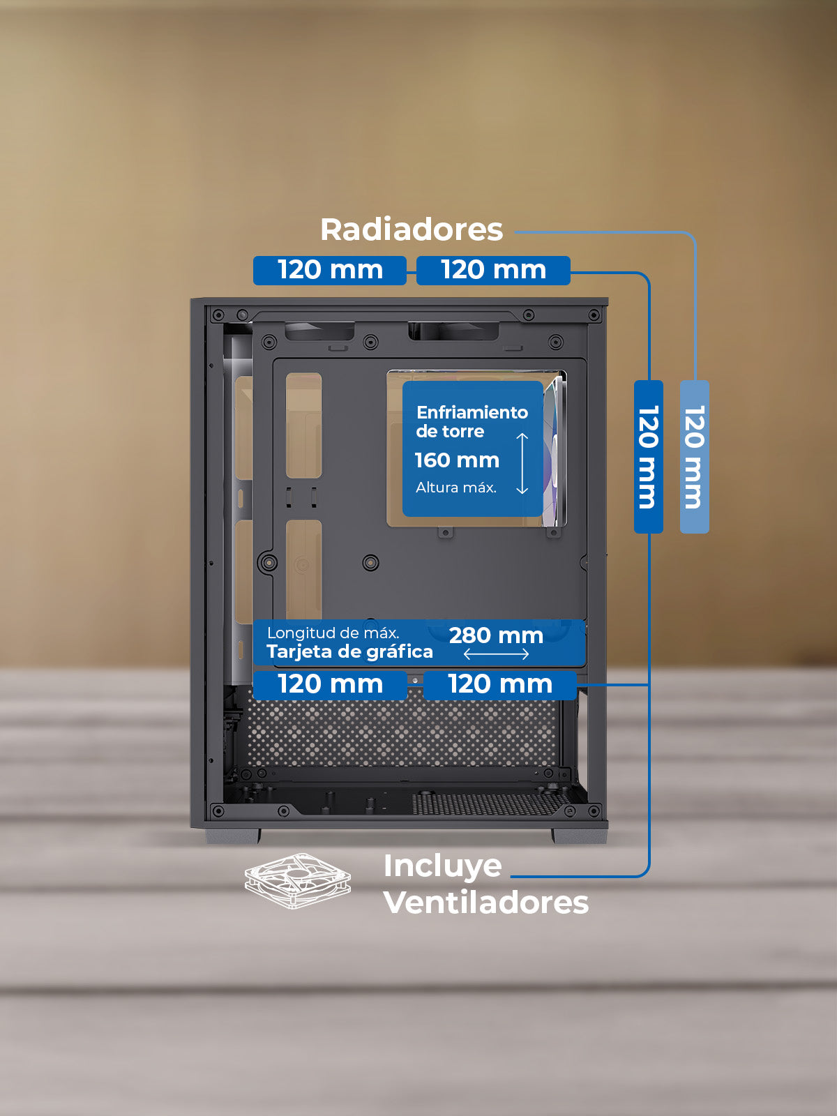 Con un diseño vanguardista, este gabinete incluye dos ventiladores superiores de 120 mm y uno trasero de 120 mm y soporta dos más de 120 mm sobre PSU, asegurando un flujo de aire constante que mantiene tus componentes frescos y funcionando al máximo rendimiento. Además soporta radiador de 120 mm en la parte trasera.