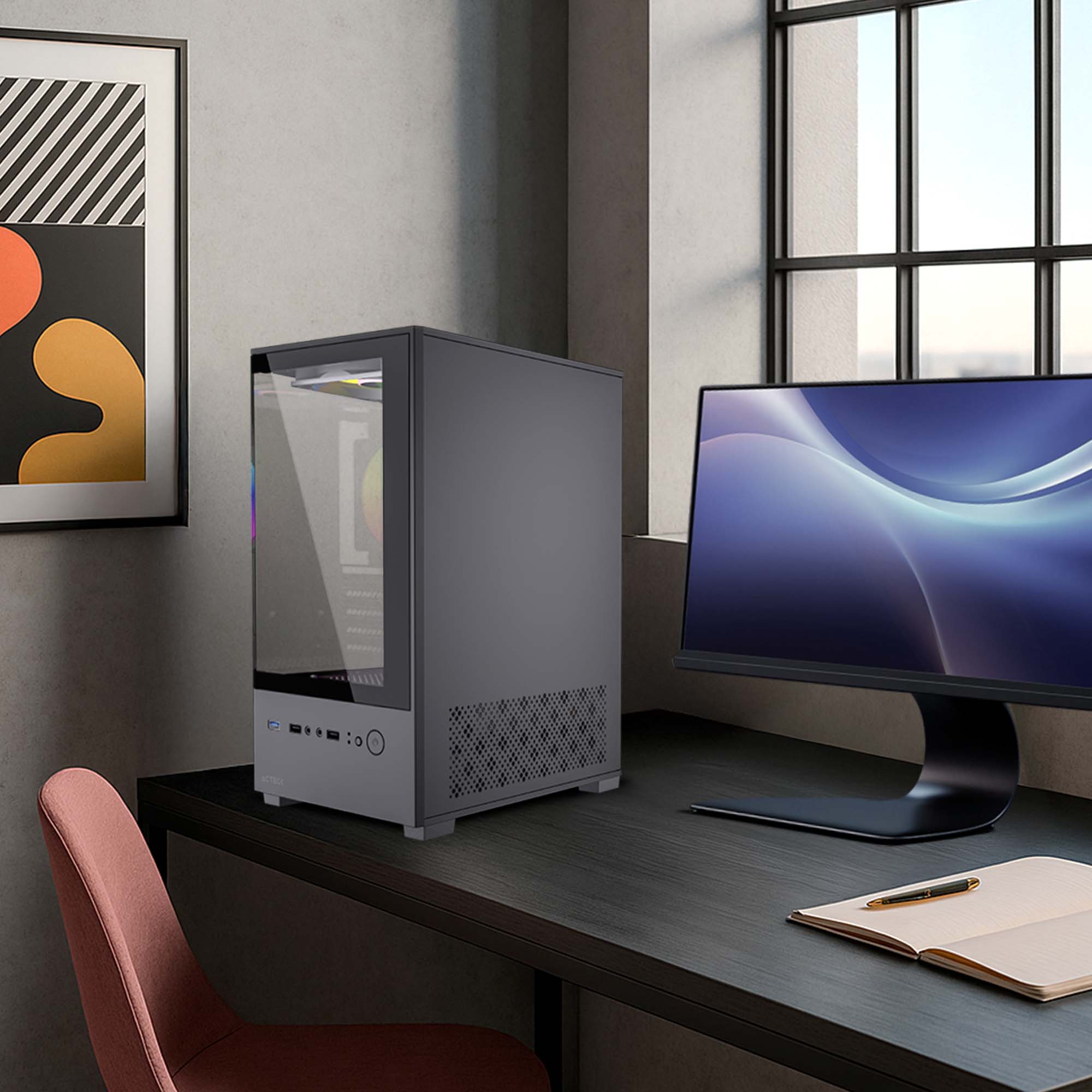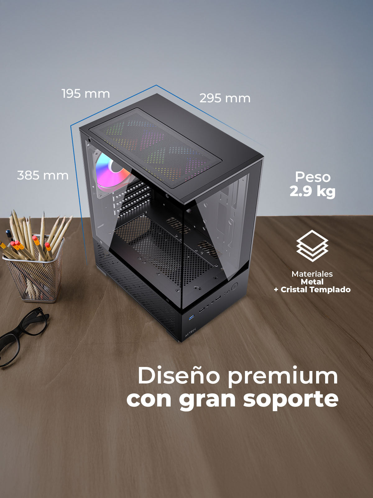 Su estructura en metal SPCC de 0.4 mm con cristal templado ofrece resistencia y estilo. Soporta enfriamiento de torre de hasta 160 mm y tarjetas gráficas de 280 mm.