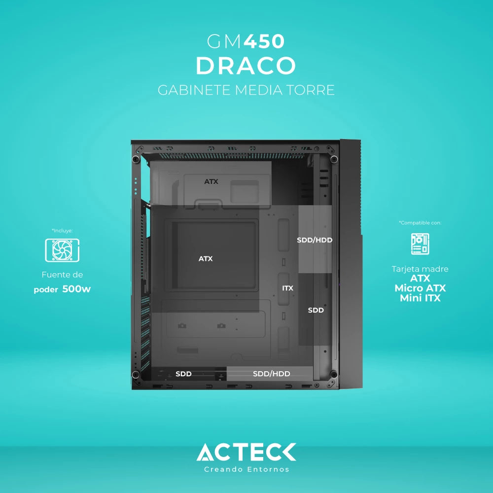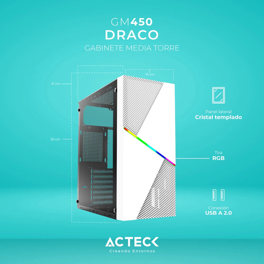 El gabinete de media torre Draco GM450 ofrece una combinación de diseño elegante, funcionalidad y opciones de personalización con iluminación RGB.