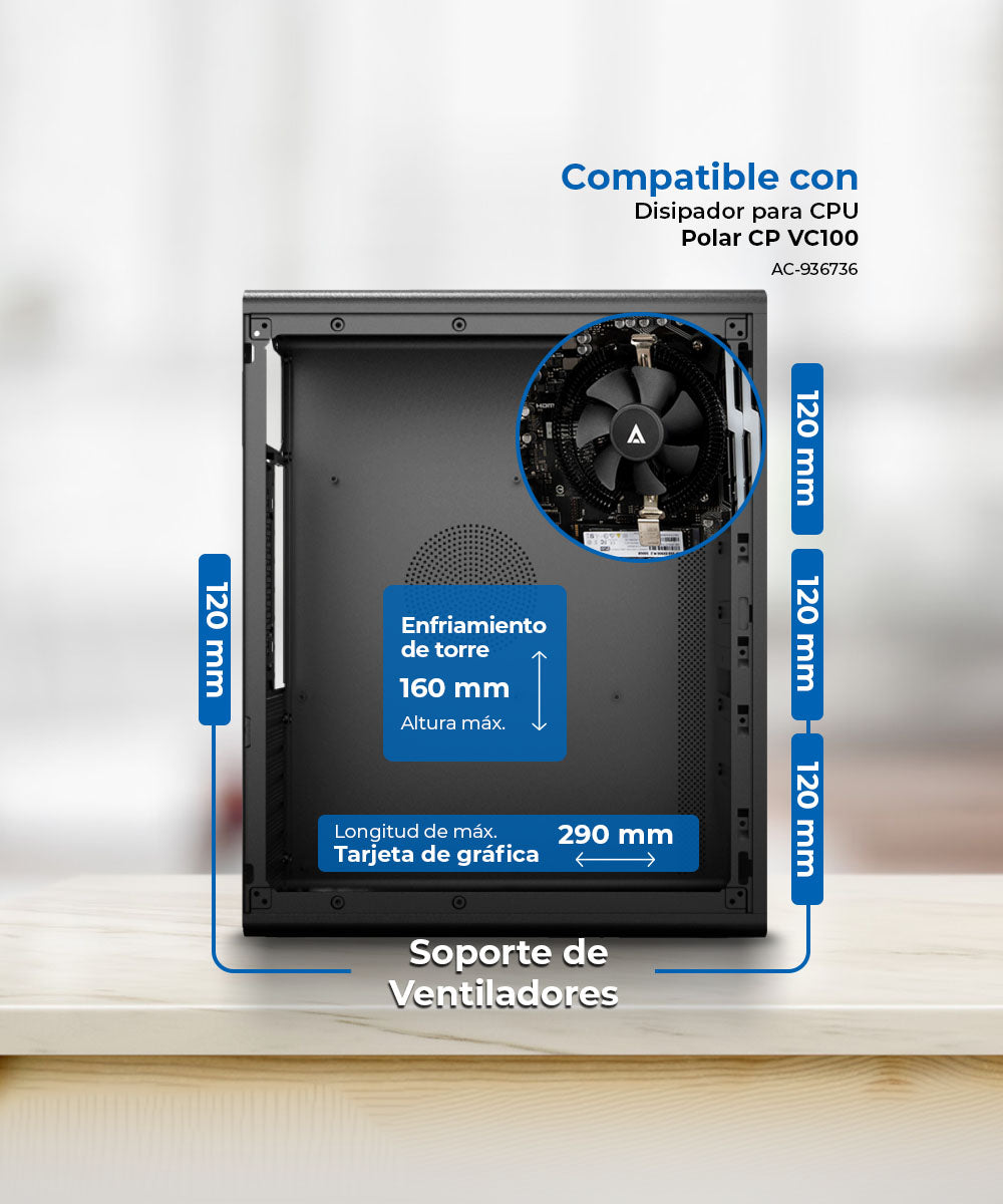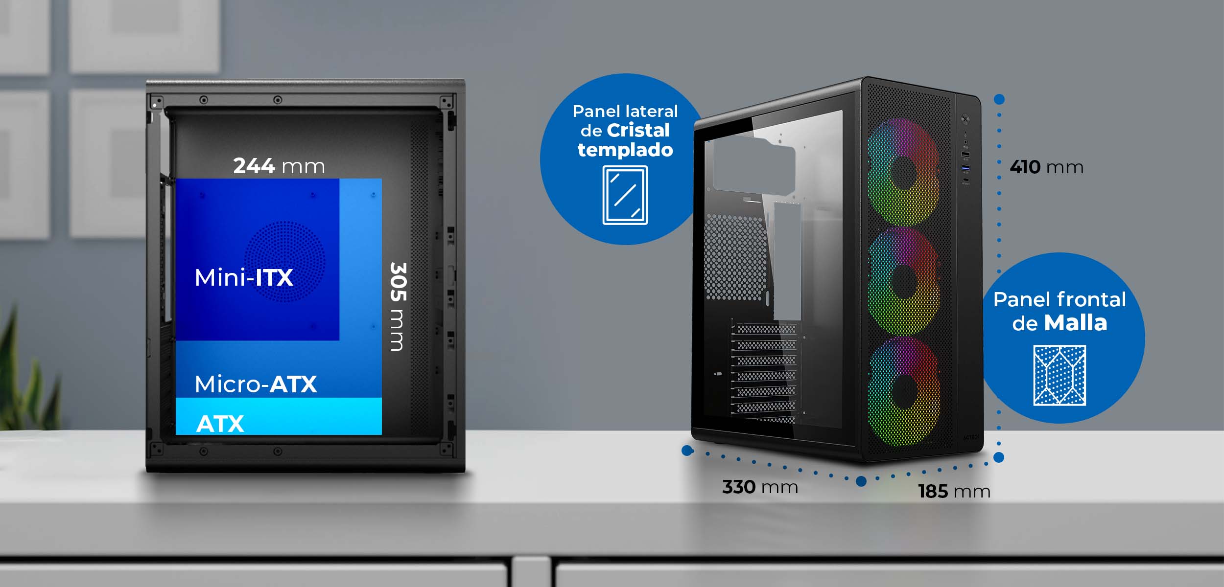 Brindando versatilidad para configuraciones de alto rendimiento y adaptabilidad a diversas necesidades de personalización, Compatible con tarjetasATX, Micro ATX e ITX.