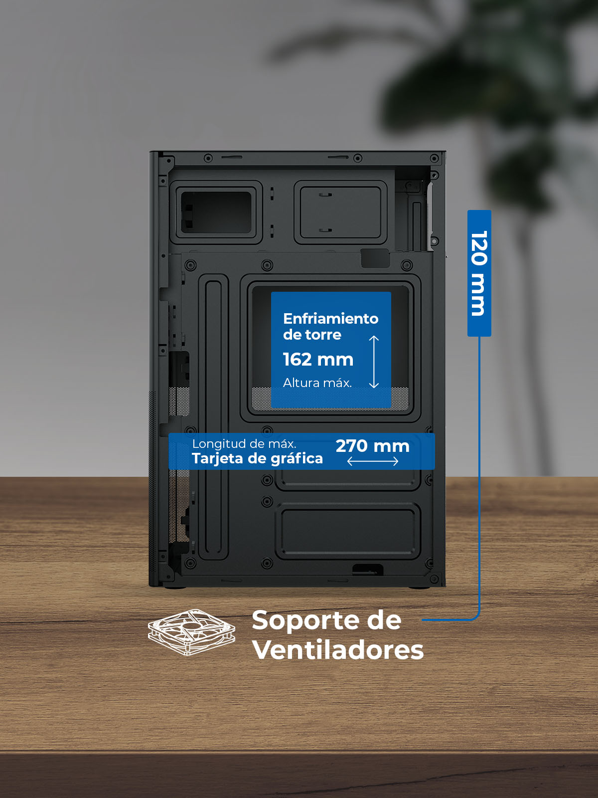 Admite un ventilador o radiador trasero de 120 mm, enfriadores de torre de hasta 162 mm y tarjetas gráficas de 270 mm, ofreciendo un sistema térmico eficiente que mantiene el rendimiento estable en tareas exigentes
