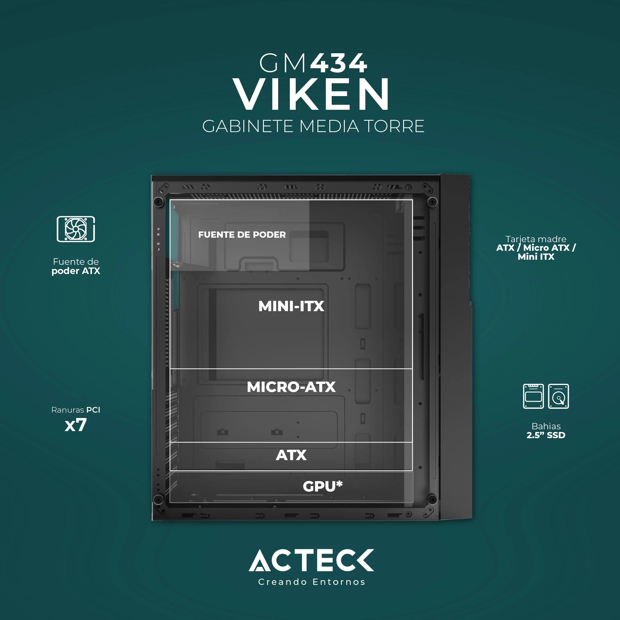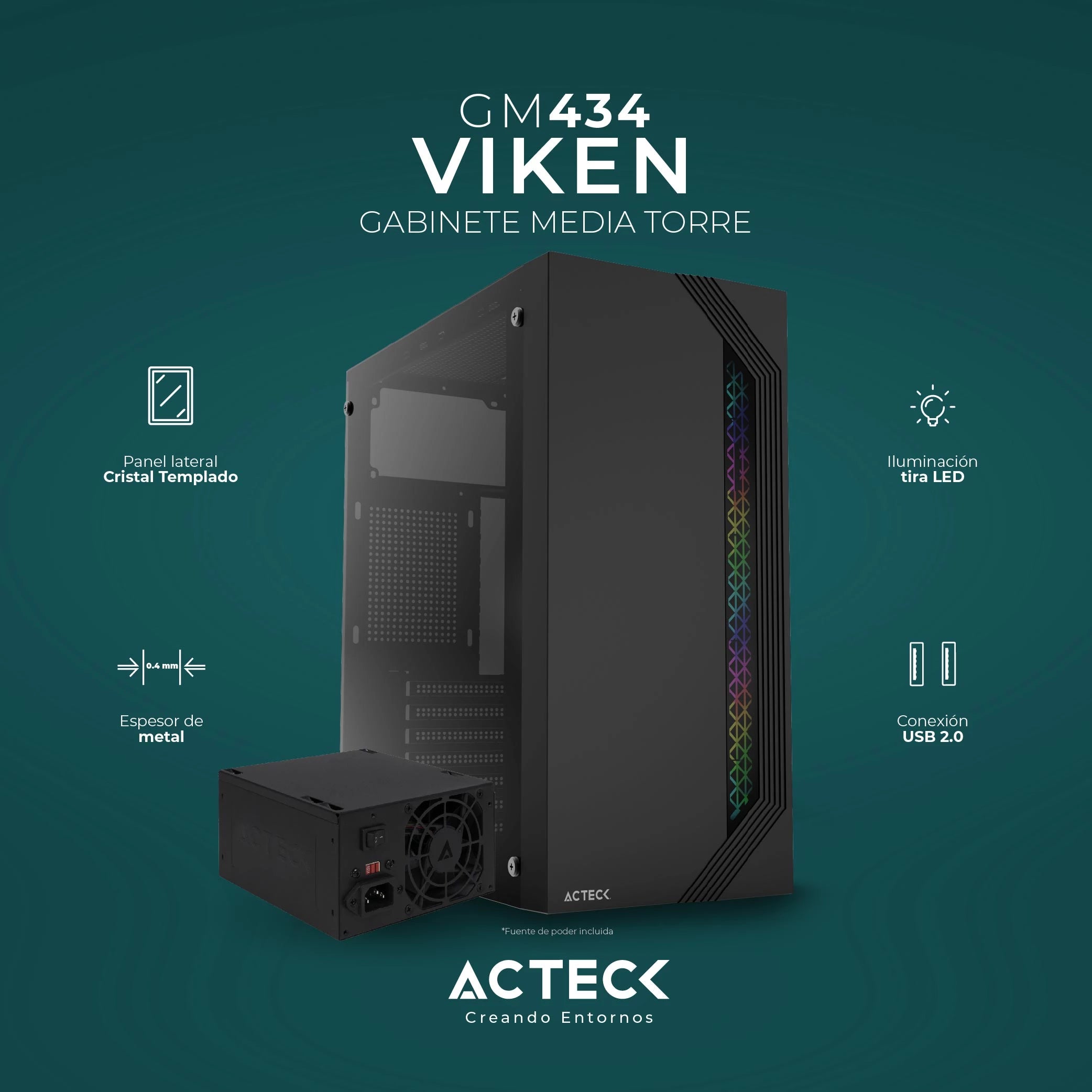 El gabinete Viken combina rendimiento y estilo. Compatible con placas base ATX y equipado con una fuente de poder ATX de 500W, ofrece 2 puertos USB 2.0 y un ventilador preinstalado para una conectividad y refrigeración óptimas. Su panel lateral de cristal y el frente sólido con iluminación RGB vertical aportan un toque moderno y elegante, ideal para cualquier configuración de PC.
