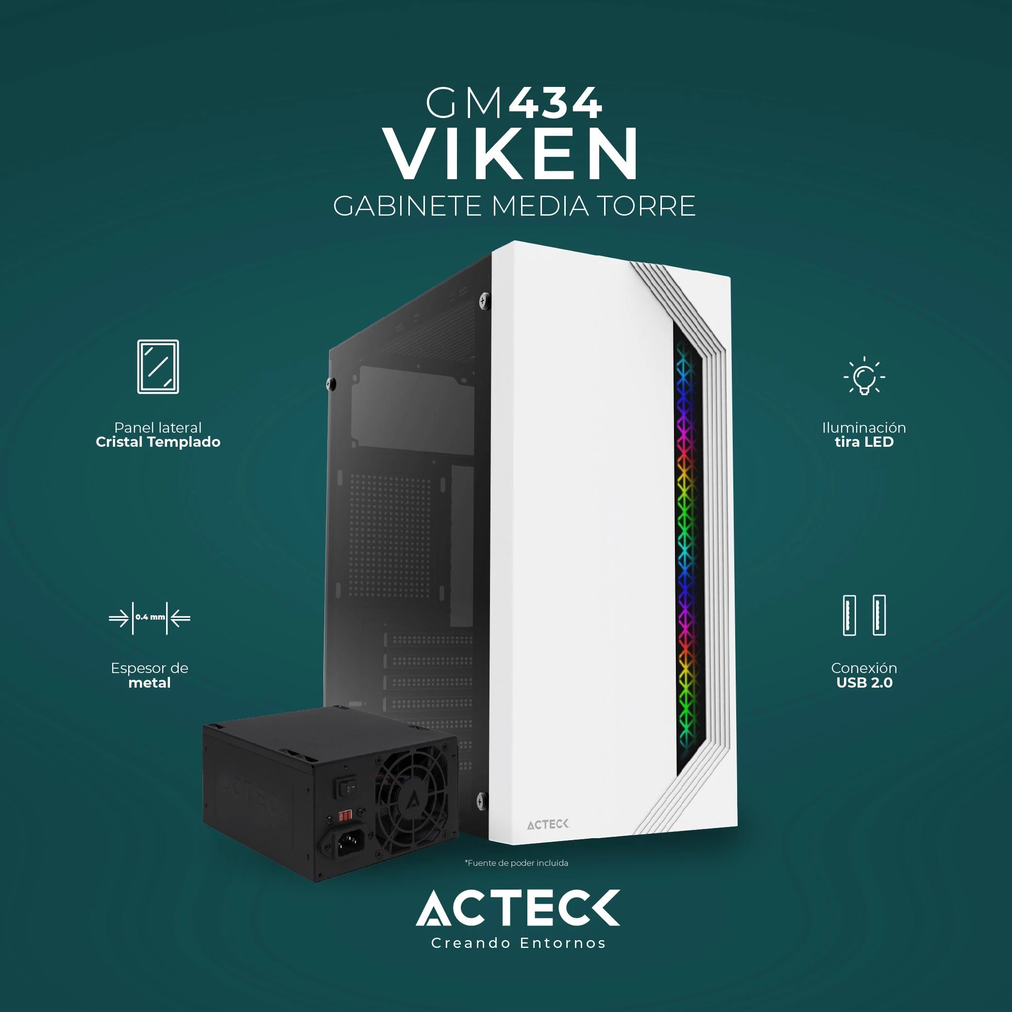 El gabinete Viken combina rendimiento y estilo. Compatible con placas base ATX y equipado con una fuente de poder ATX de 500W, ofrece 2 puertos USB 2.0 y un ventilador preinstalado para una conectividad y refrigeración óptimas. Su panel lateral de cristal y el frente sólido con iluminación RGB vertical aportan un toque moderno y elegante, ideal para cualquier configuración de PC.