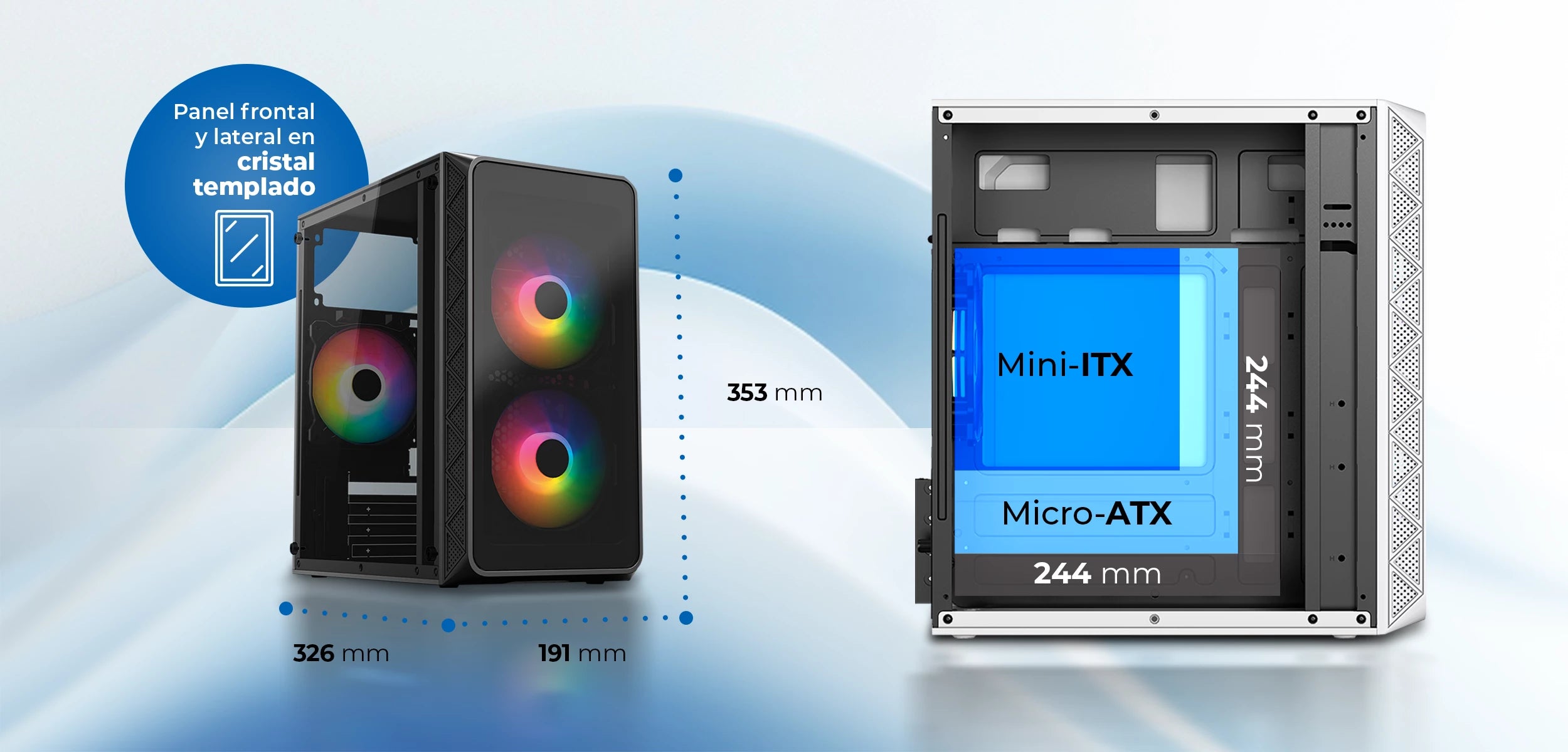 Disfruta de la mejor combinación entre estética y funcionalidad con nuestros gabinetes, equipados con paneles de cristal templado lateral y frontal. Su diseño compacto de 326x191x353 mm te permite integrar fácilmente tu equipo en cualquier espacio.