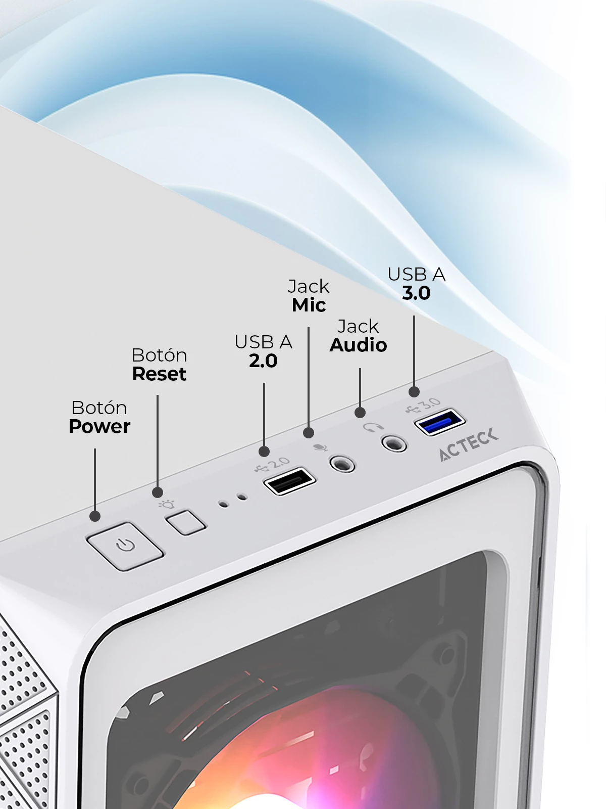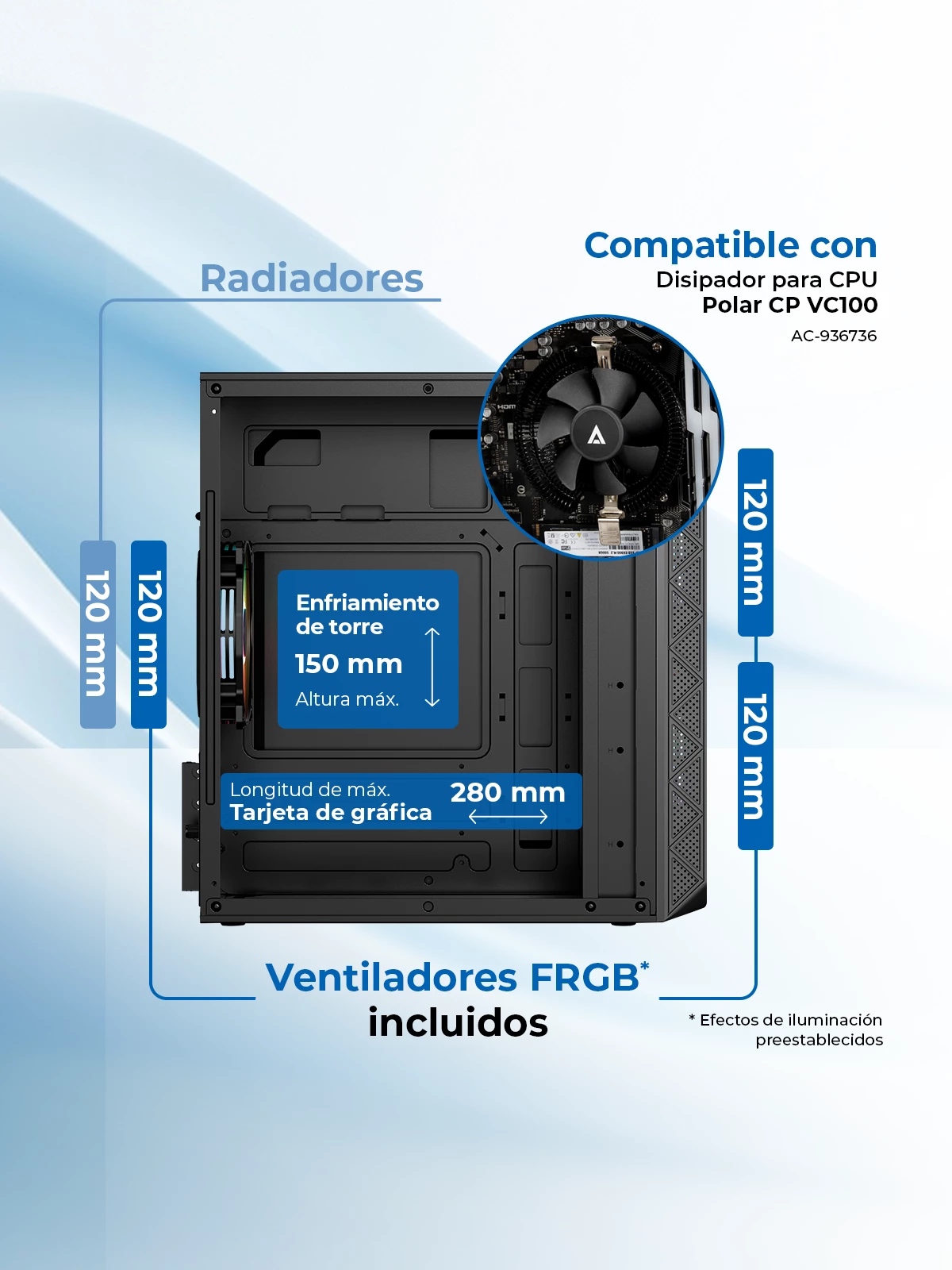 Nuestros gabinetes están diseñados para ofrecer un enfriamiento óptimo con soporte para torres de enfriamiento de hasta 150 mm y espacios dedicados para ventiladores FRGB. Con una longitud máxima de 280 mm, mantén tu sistema fresco y funcionando al máximo rendimiento. Además, los ventiladores FRGB añaden un toque de estilo único a tu equipo. ¡Maximiza el rendimiento y el estilo de tu PC!