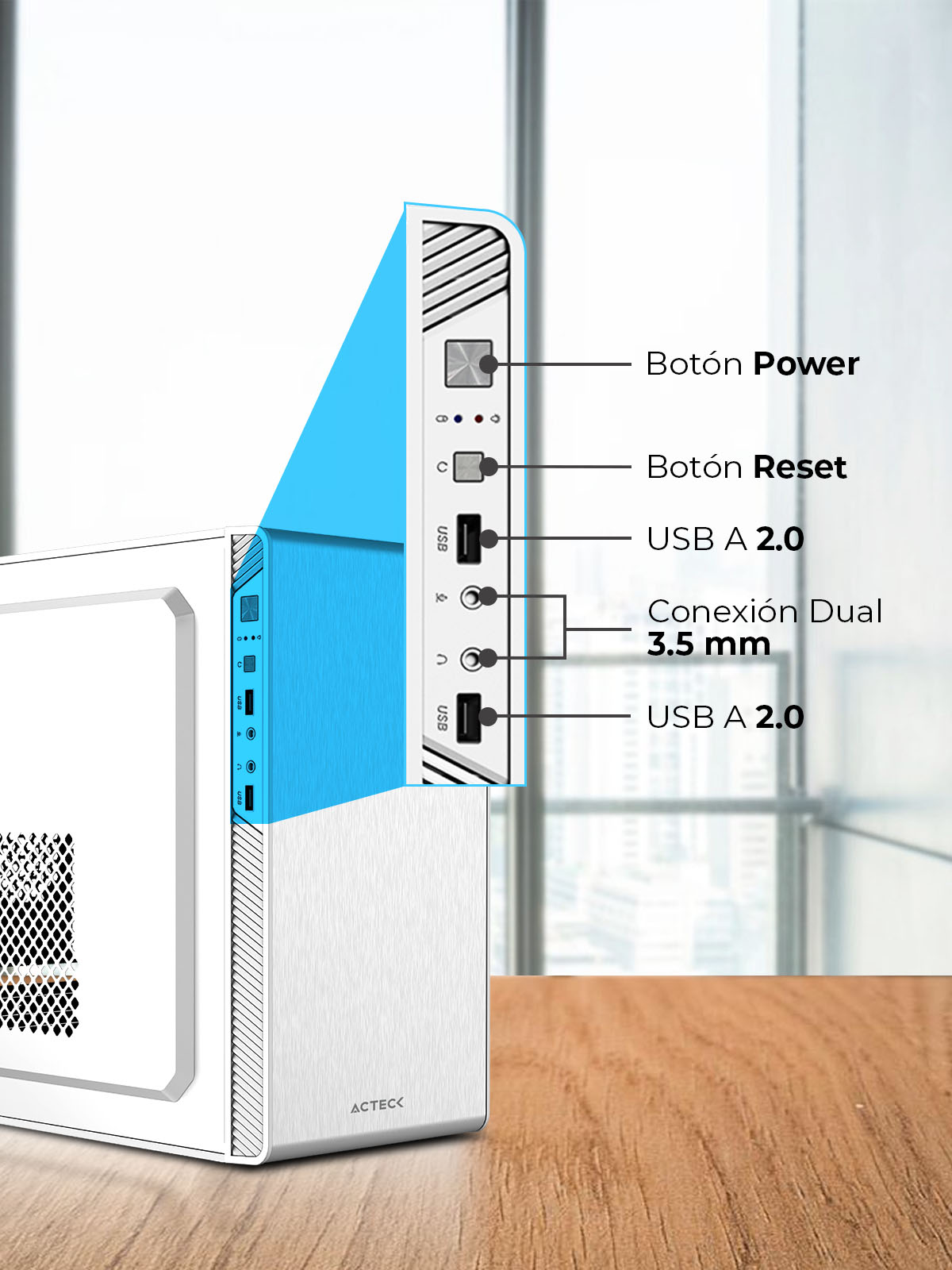 Contar con dos conectores USB 2.0, botones de encendido y reinicio, y una conexión dual para micrófono y audífonos de jack 3.5 ofrece comodidad y funcionalidad. Estas características permiten acceso rápido a tus periféricos, mayor control sobre el sistema y facilidad para gestionar tus dispositivos de audio, lo que mejora la experiencia de uso y productividad diaria.
