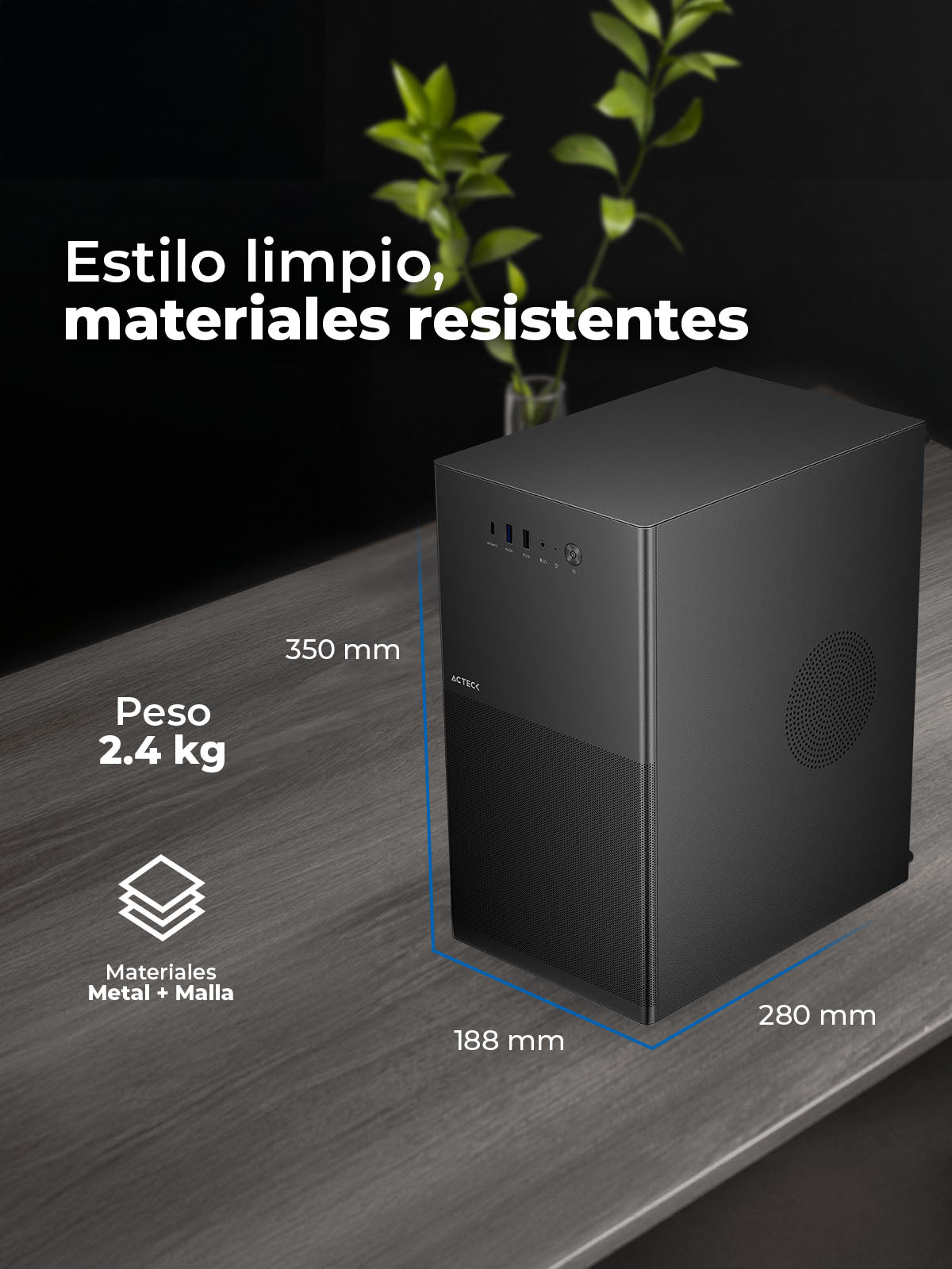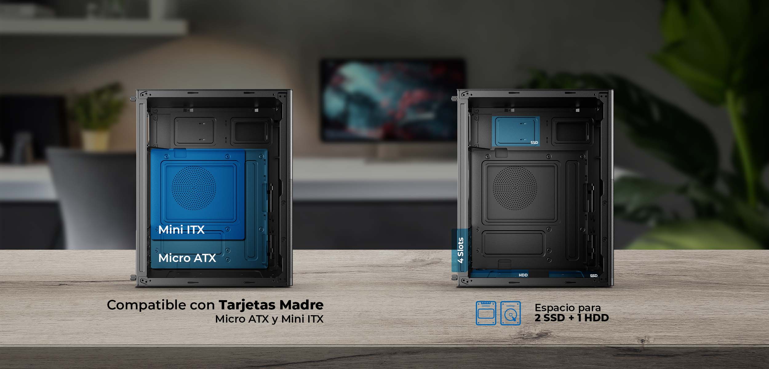 Diseñado para adaptarse a distintas configuraciones, este gabinete soporta tarjetas madre Micro ATX y Mini ITX, ofreciendo versatilidad para usuarios que buscan rendimiento en un formato compacto y práctico.