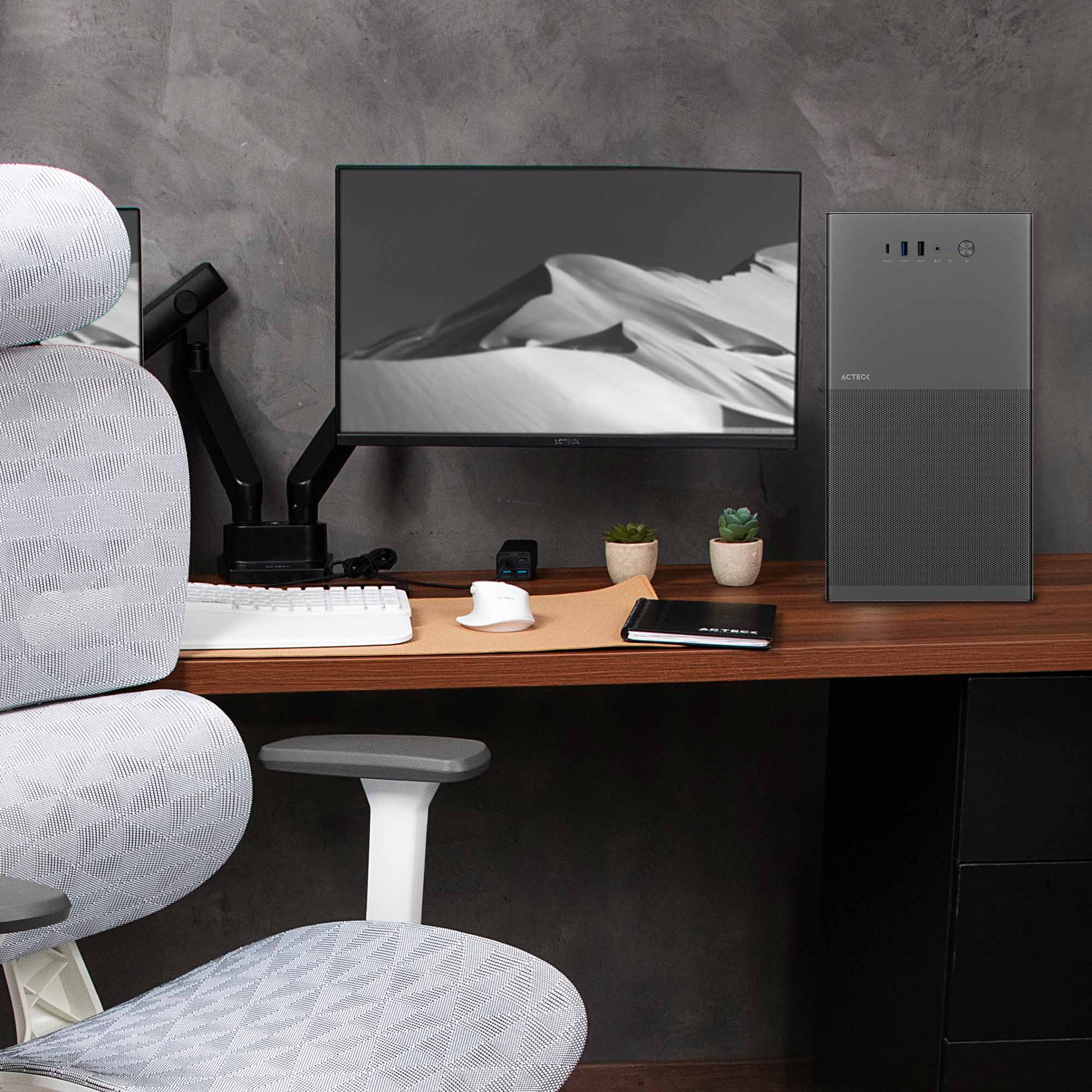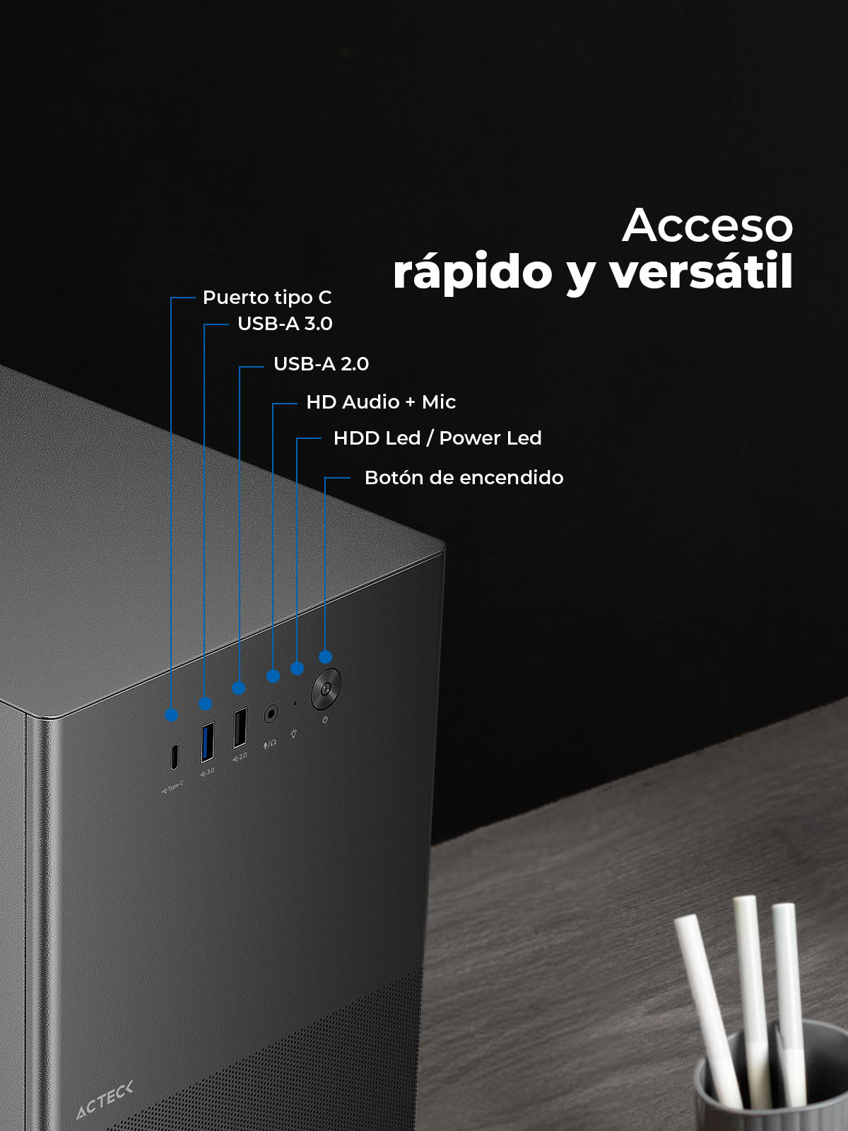 Este gabinete ofrece conectividad moderna con puertos Tipo C, USB 3.0, USB 2.0 y entrada Dual HD Audio + Mic de 3.5 mm. Todo lo necesario para trabajar, jugar y conectar periféricos sin complicaciones.