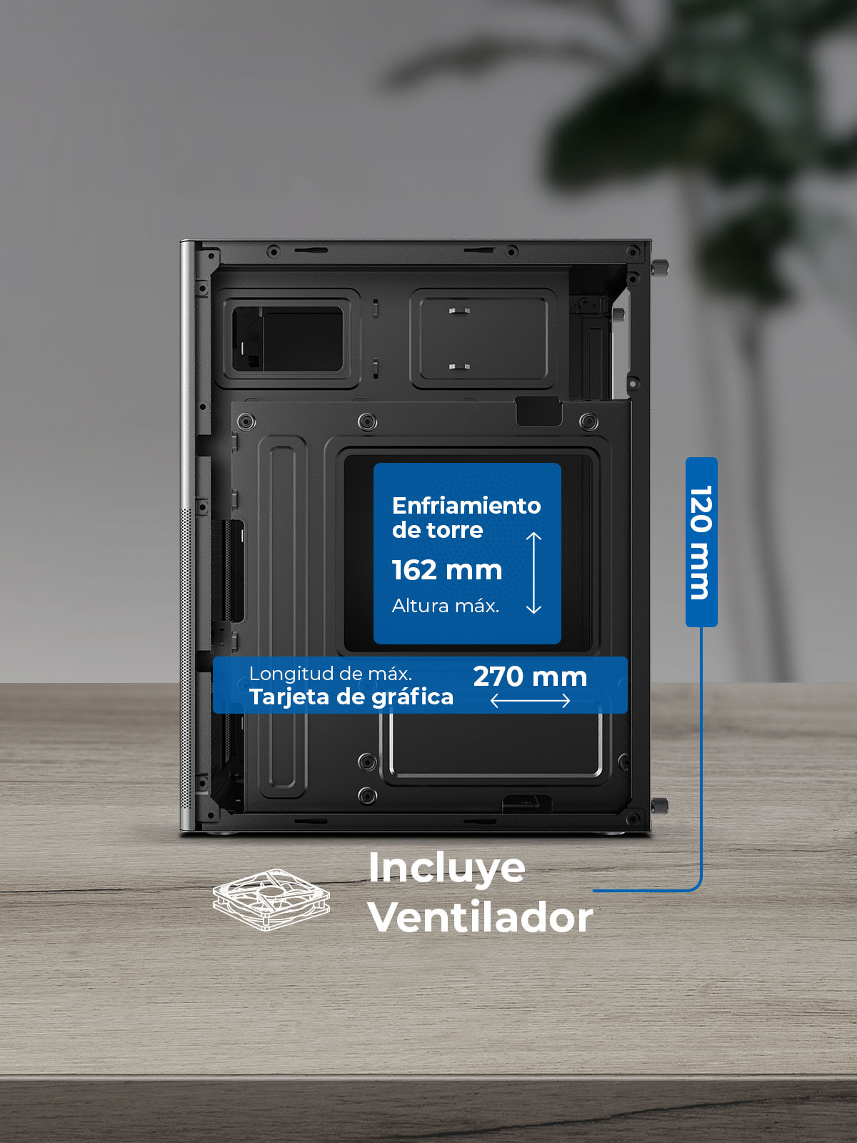 Pensado para mantener un rendimiento estable, soporta un ventilador o radiador de 120 mm, enfriadores de torre de hasta 162 mm y tarjetas gráficas de 270 mm. Potencia y seguridad térmica para sistemas compactos exigentes