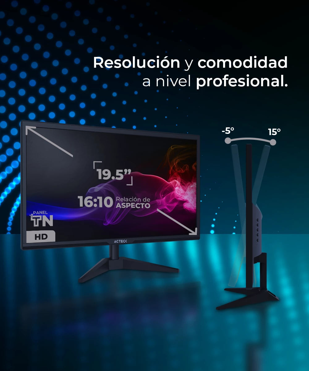 Cuenta con una pantalla de 19.5 pulgadas, ideal para una experiencia visual inmersiva y amplia. Equipado con tecnología de panel TN, garantiza tiempos de respuesta rápidos y colores vibrantes para una visualización nítida y sin desenfoques. Además, su ángulo de inclinación ajustable te permite encontrar la posición óptima para tu comodidad visual, proporcionando una experiencia de visualización ergonómica y personalizada