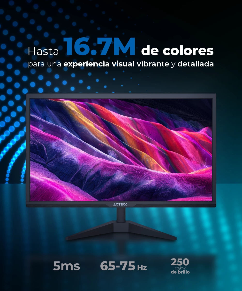 Es un monitor plano de 19.5 pulgadas, con una resolución HD ideal para uso profesional y personal. Con tecnología TN, un tiempo de respuesta de 5 ms y una frecuencia de actualización de 75-60 Hz, ofrece imágenes nítidas y fluidas. Equipado con puertos HDMI y VGA, proporciona conectividad versátil, y su diseño elegante en negro con una base en forma de V añade un toque sofisticado a cualquier espacio. Este monitor es perfecto para mejorar la productividad y la eficiencia en el entorno laboral, combinando funcionalidad y estética moderna.