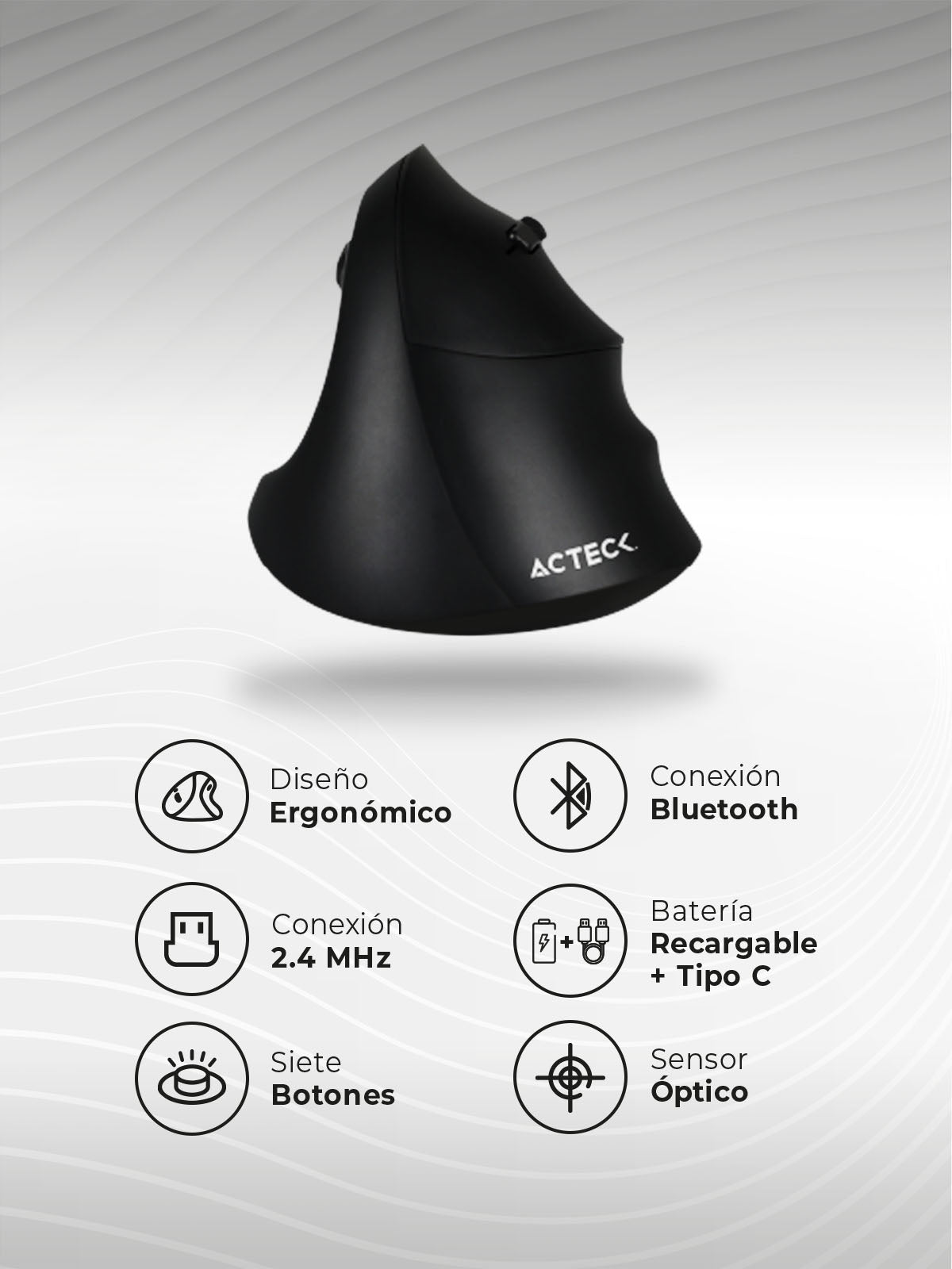 Transforma tu espacio de trabajo con nuestro mouse vertical ergonómico: conectividad Bluetooth y 2.4GHz sin fisuras, impulsado por una batería recargable para una productividad y comodidad inigualables.