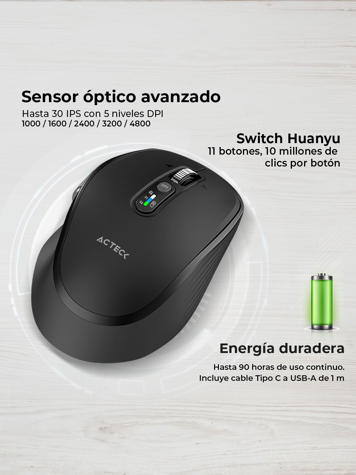 Su batería ofrece hasta 90 horas de uso continuo con solo 3 horas de carga, e incluye cable de 1 m Tipo-C para mantener tu productividad diaria.