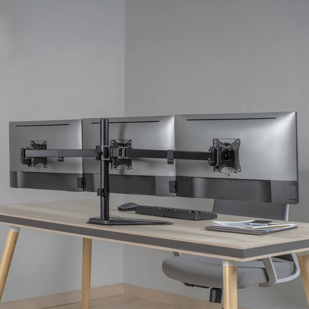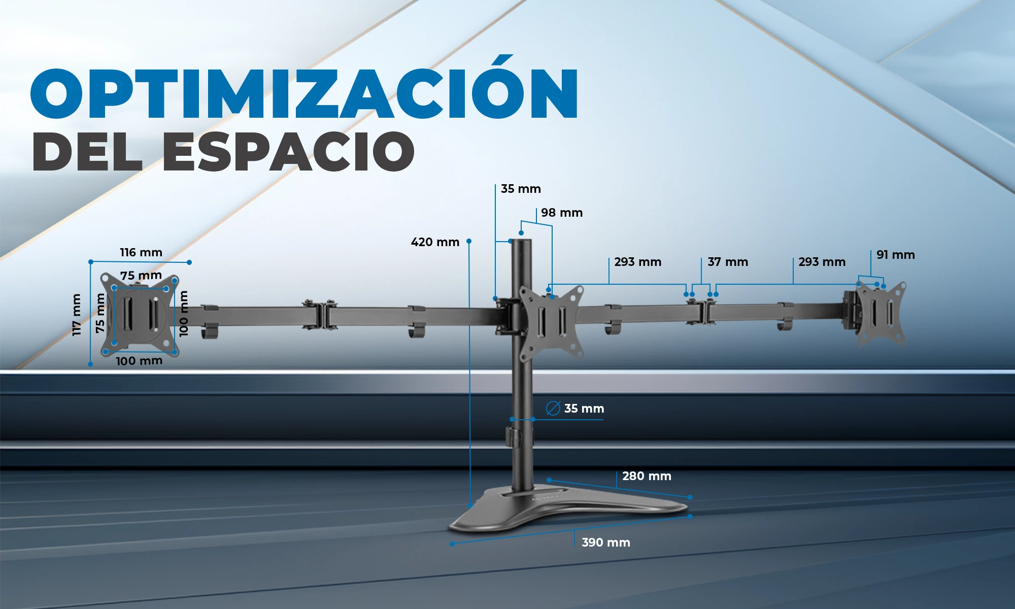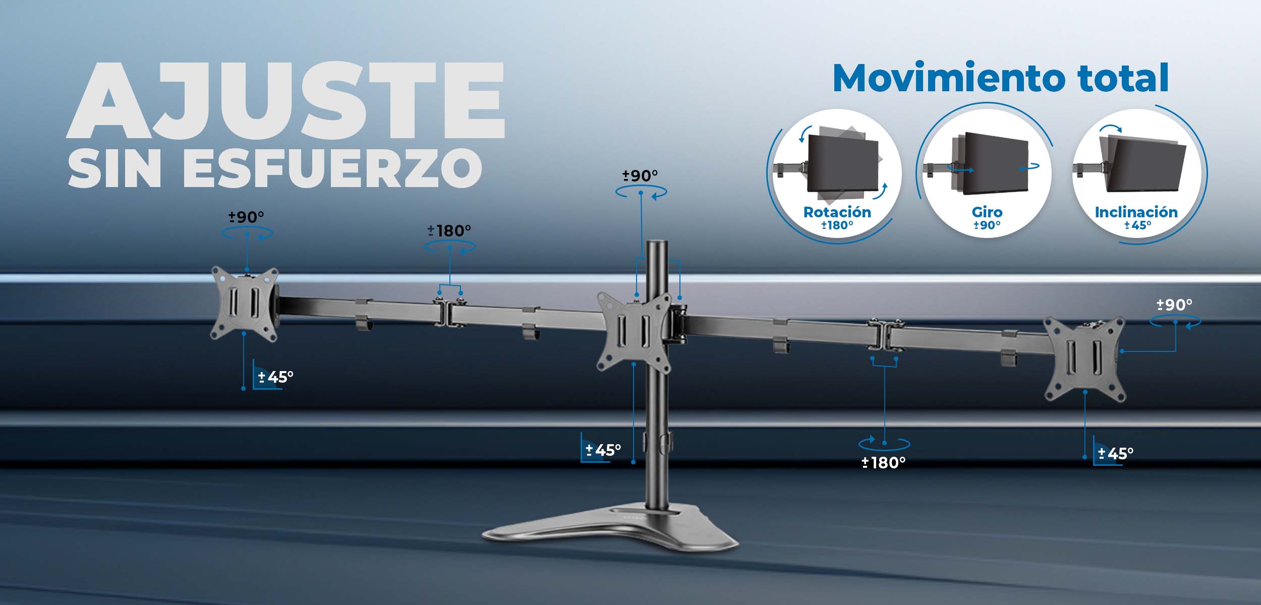Transforma tu espacio de trabajo en un centro de control eficiente y organizado con nuestro soporte para 3 monitores.