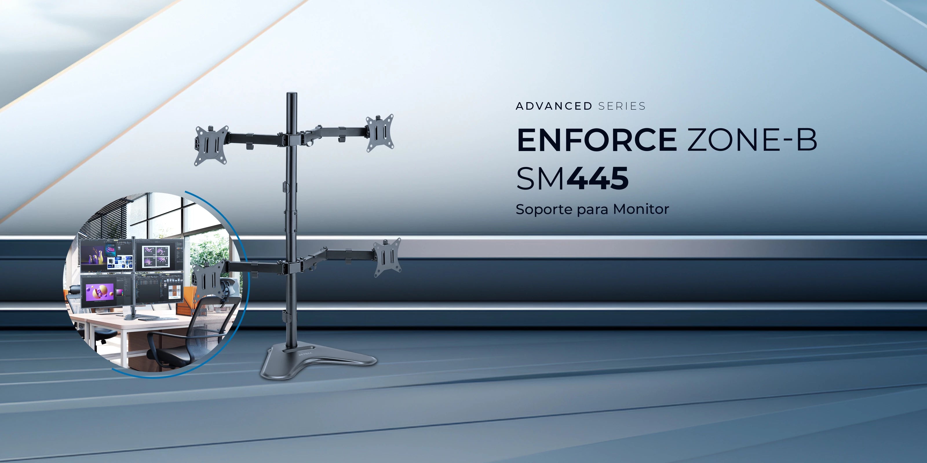 Transforma tu espacio de trabajo en un santuario de minimalismo con el soporte articulado para 4 monitores Enforce Zone-B SM445. Este elegante soporte maximiza la eficiencia y organiza tu oficina de manera impecable, eliminando el desorden y promoviendo un entorno de trabajo limpio y moderno.