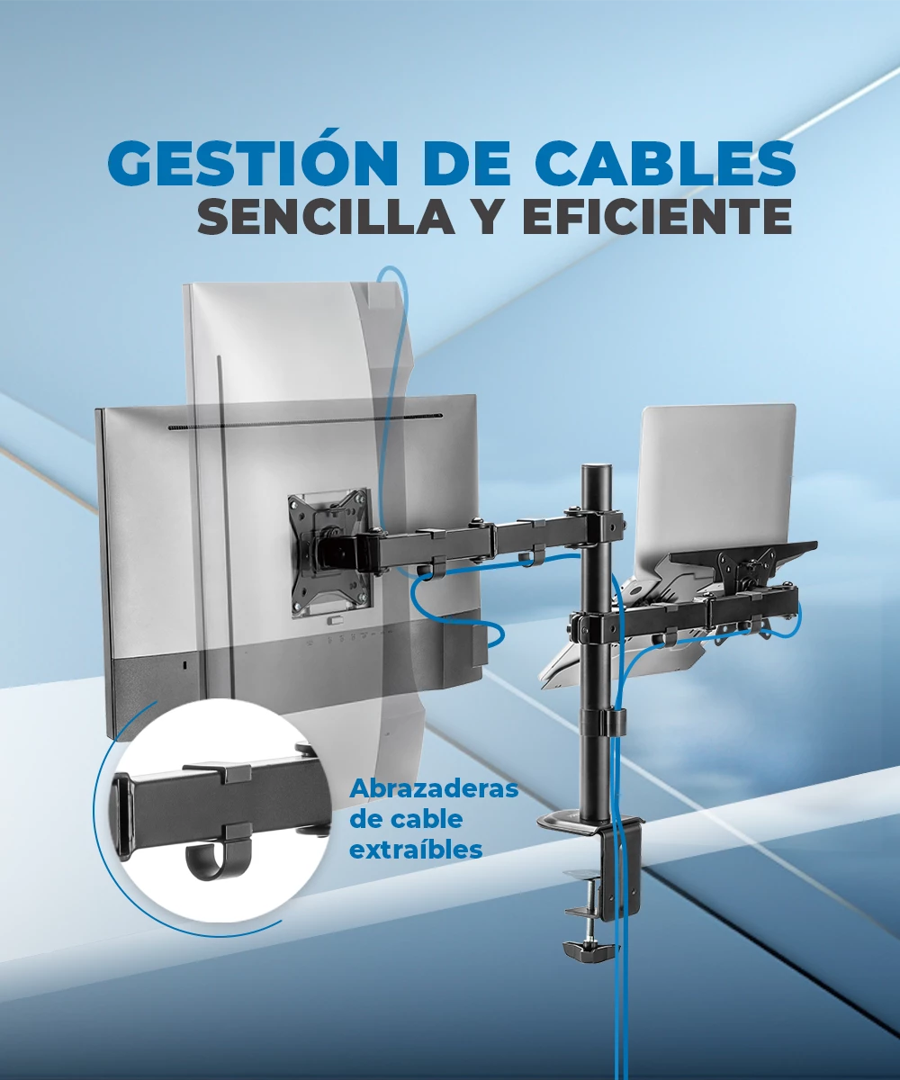 Asegura un espacio de trabajo limpio y ordenado gracias a sus abrazaderas de cable extraíbles. Estas abrazaderas facilitan la organización y gestión de cables, eliminando el desorden y mejorando la estética de tu estación de trabajo.