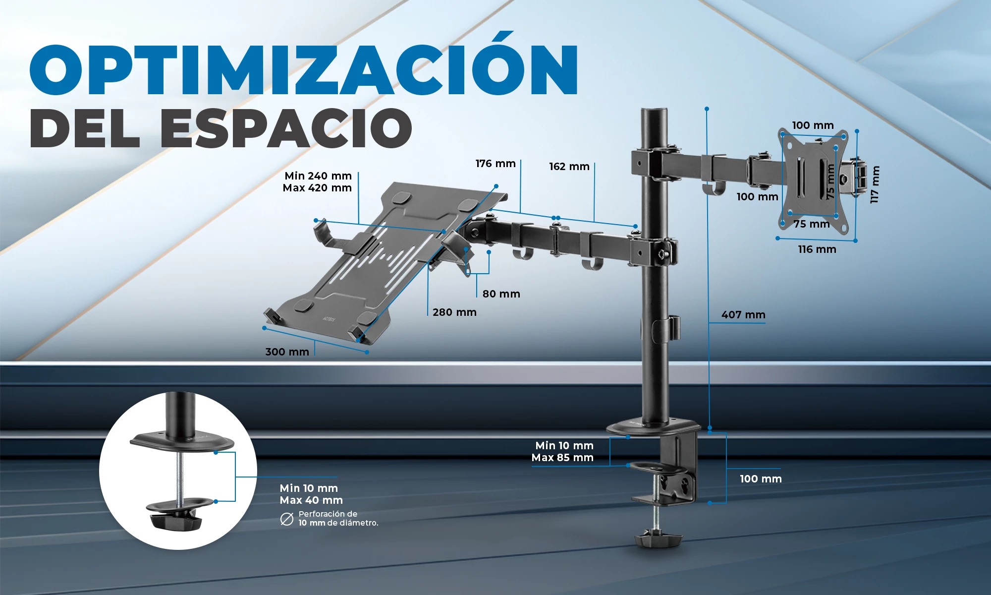 Optimiza tu espacio de trabajo con el Soporte Articulado para Escritorio Enforce Zone SM480, diseñado para monitores de 17" a 32" y laptops, soportando hasta 9 kg y 4 kg respectivamente. Parte de la Advanced Series, este soporte en elegante color negro ofrece ajustes precisos y articulados que mejoran la ergonomía y la productividad. Compatible con soportes VESA de 75x75mm y 100x100mm, y con una fijación C-Clamp de fácil instalación, es la solución ideal para profesionales que buscan eficiencia y comodidad en su estación de trabajo. Mejora tu rendimiento diario con el Enforce Motion SM480, que reduce el desorden y promueve un entorno laboral más saludable.