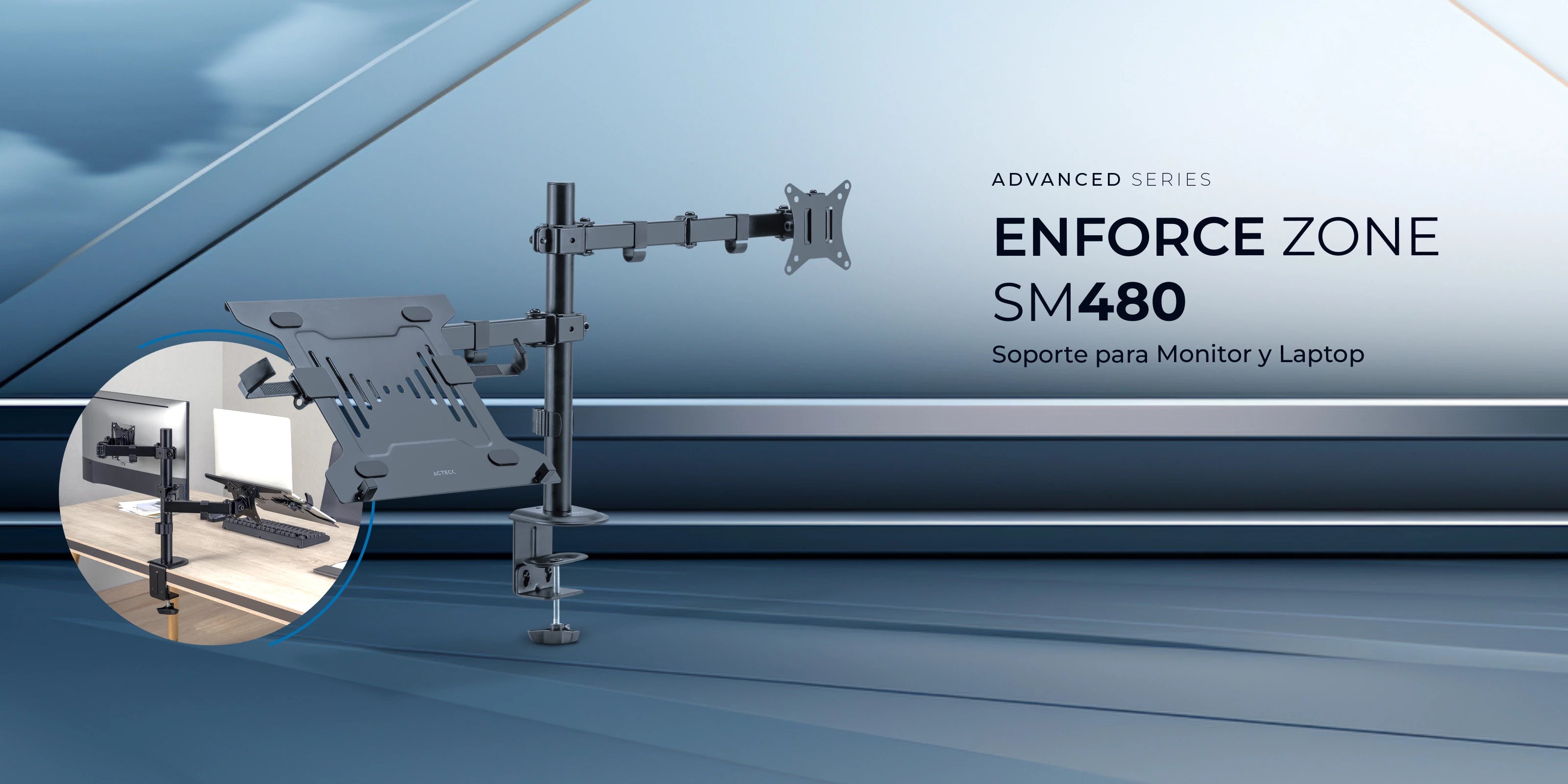 Optimiza tu espacio de trabajo con el Soporte Articulado para Escritorio Enforce Zone SM480, diseñado para monitores de 17" a 32" y laptops, soportando hasta 9 kg y 4 kg respectivamente. Parte de la Advanced Series, este soporte en elegante color negro ofrece ajustes precisos y articulados que mejoran la ergonomía y la productividad. Compatible con soportes VESA de 75x75mm y 100x100mm, y con una fijación C-Clamp de fácil instalación, es la solución ideal para profesionales que buscan eficiencia y comodidad en su estación de trabajo. Mejora tu rendimiento diario con el Enforce Motion SM480, que reduce el desorden y promueve un entorno laboral más saludable.