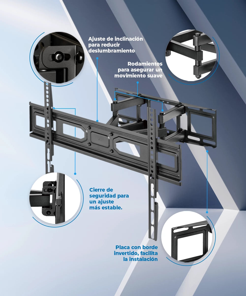 Gracias a su capacidad de inclinación y giro, puedes ajustar la pantalla a tu ángulo de visión ideal, reduciendo la fatiga visual y mejorando tu experiencia de visualización. Ya sea para trabajar, ver tus series favoritas o hacer presentaciones, este soporte te ofrece la flexibilidad que necesitas para un uso cómodo y personalizado de tu pantalla.