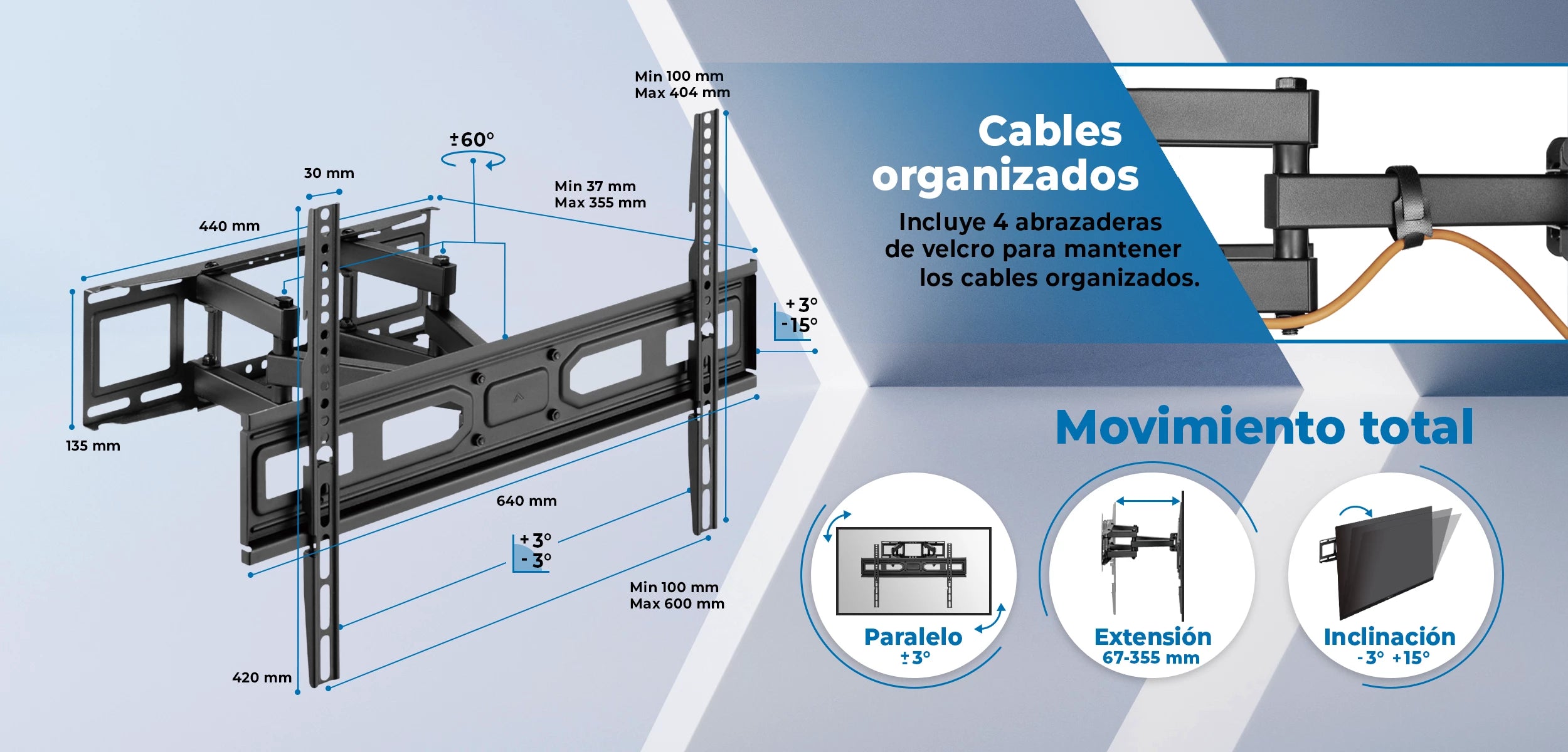 Su estructura minimalista y acabado en negro se integran de manera armoniosa en cualquier ambiente, proporcionando una apariencia moderna y despejada. Este soporte no solo ahorra espacio, sino que también mejora la estética de tu entorno, permitiéndote disfrutar de una instalación limpia y profesional.