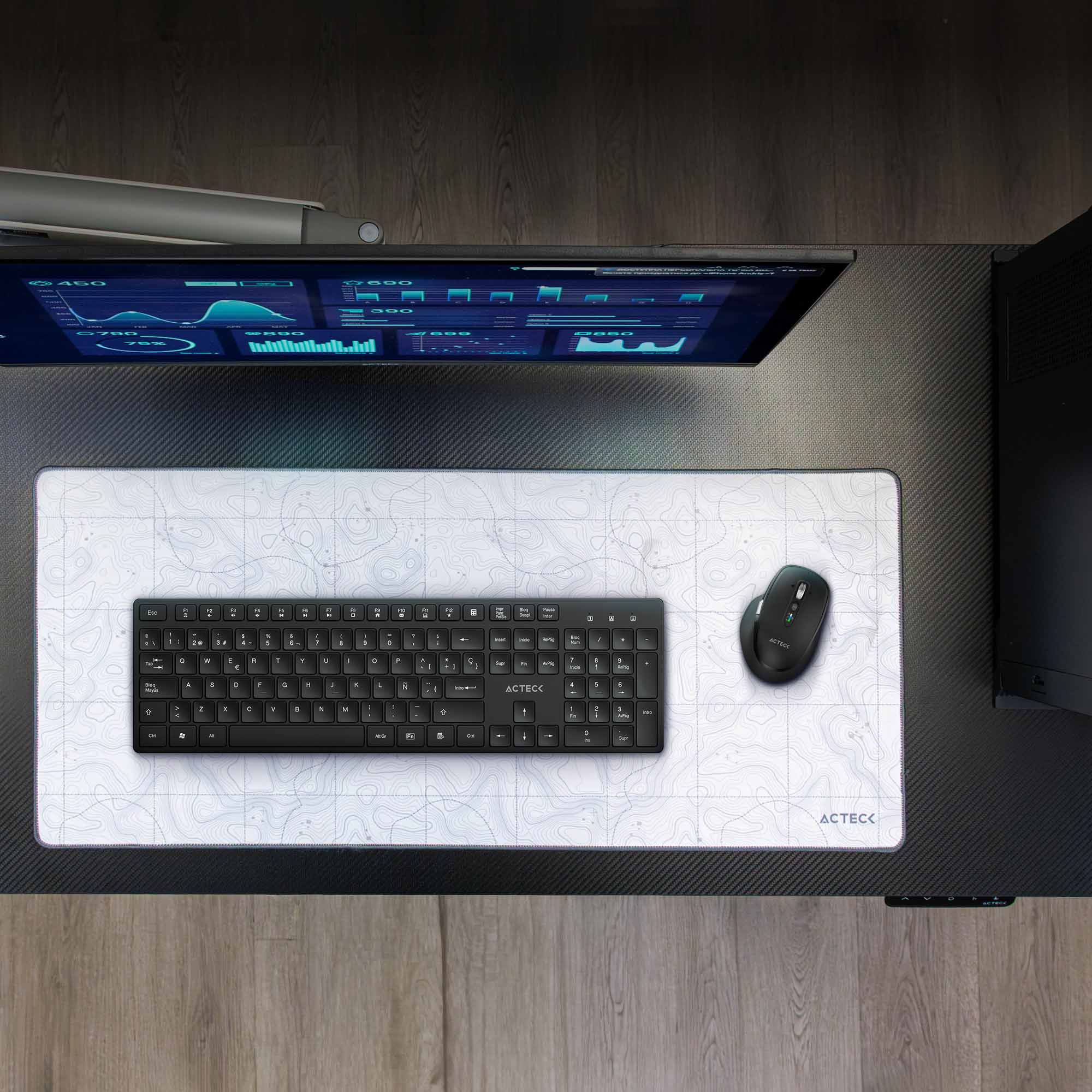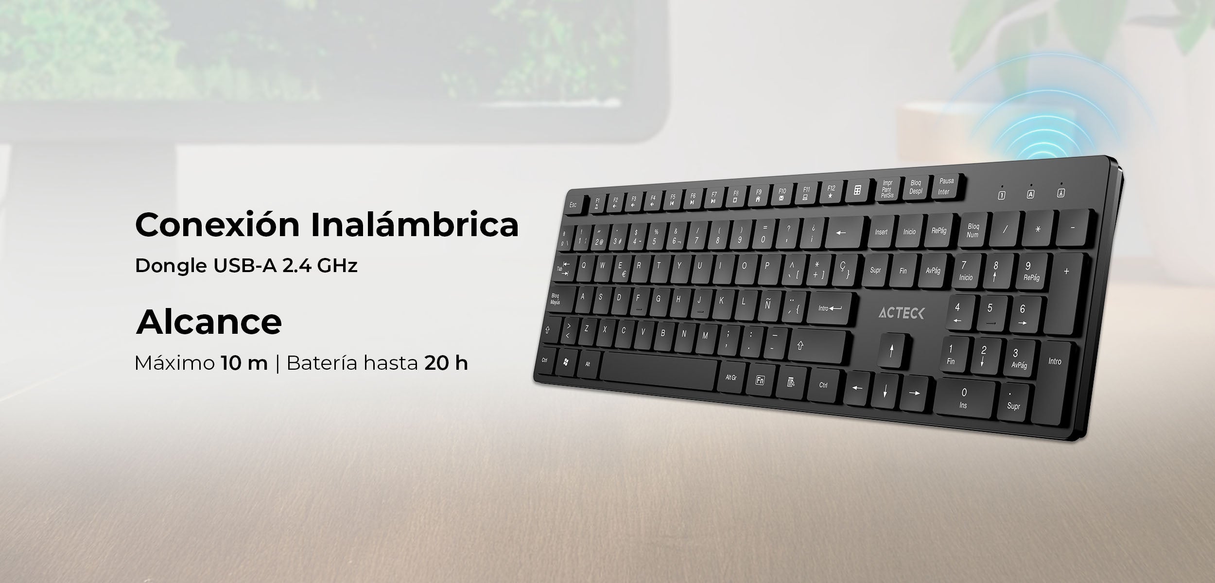 Teclado con conexión inalámbrica mediante Dongle USB-A, ofrece un alcance máximo de 10 metros y batería de larga duración de hasta 20 horas de uso continuo.