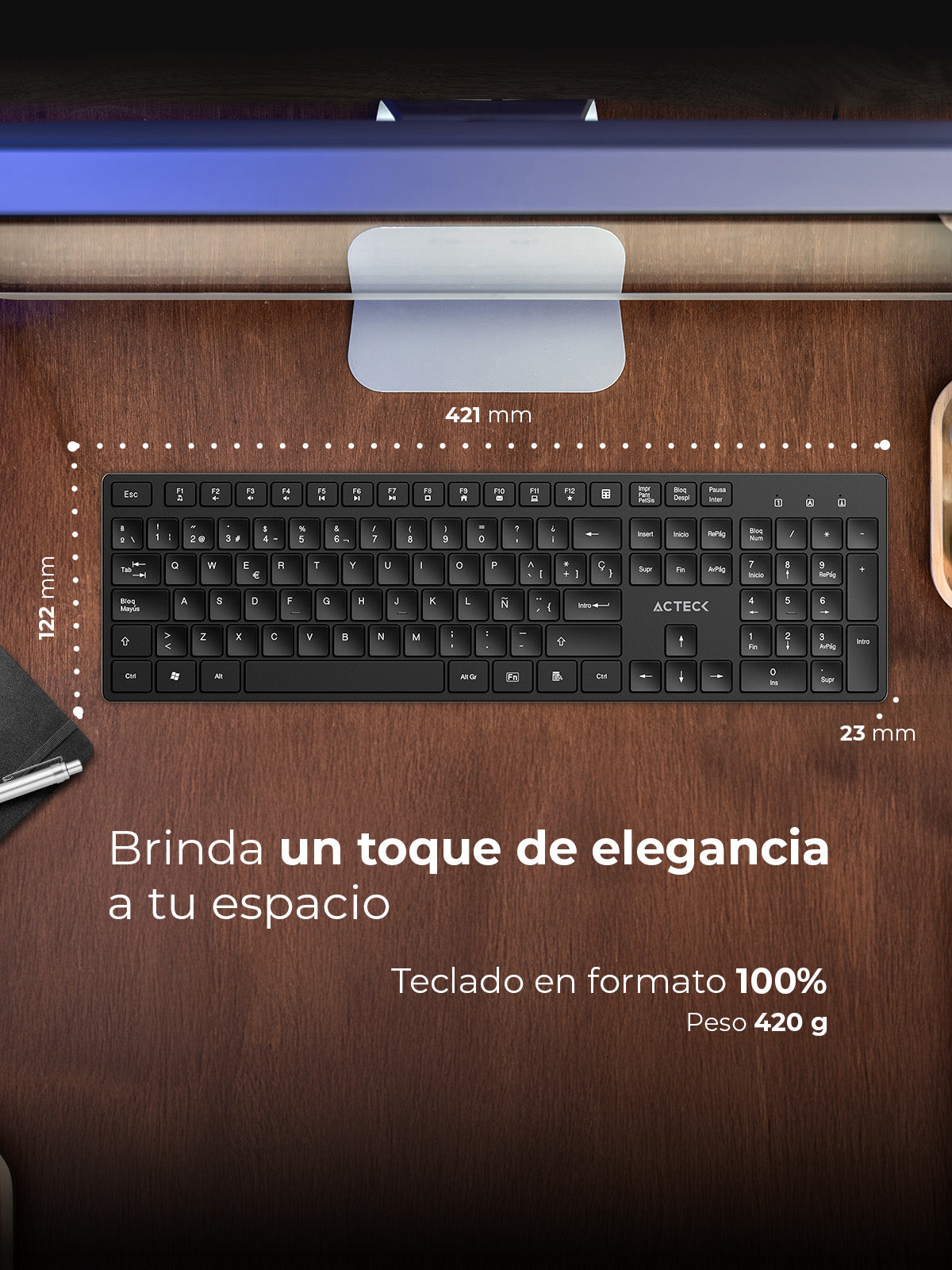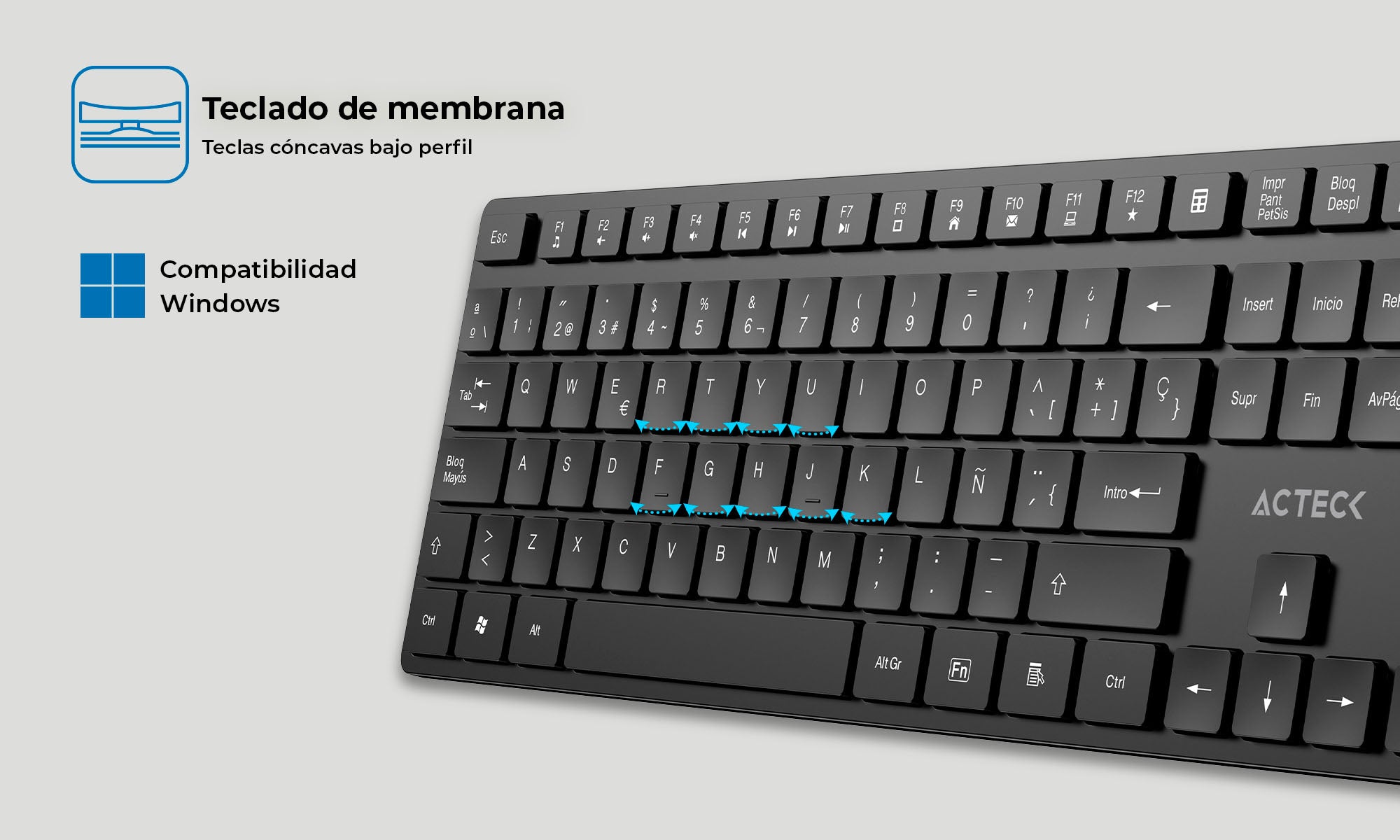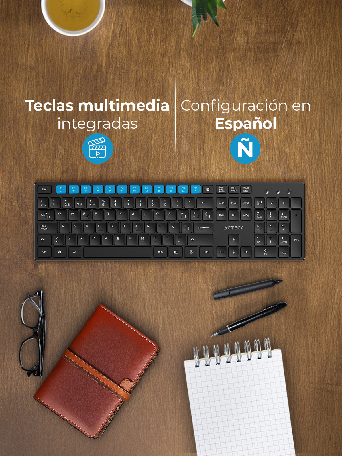 Teclado con distribución en español y funciones multimedia que facilitan el acceso rápido, que optimizan la experiencia en tareas diarias o de entretenimiento.