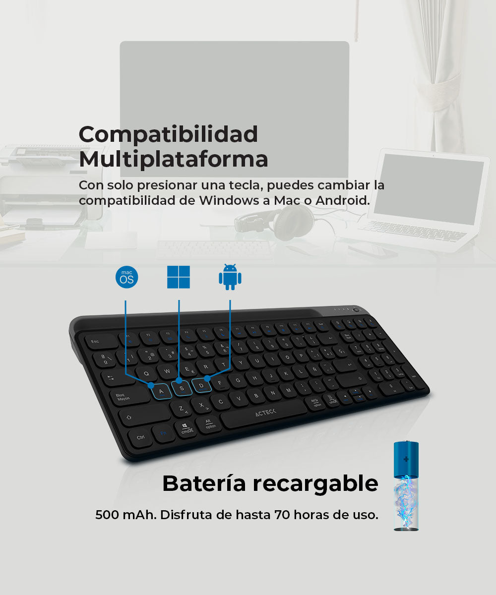 Con una sola carga, podrás trabajar sin preocuparte por quedarte sin energía. Además, su compatibilidad con Windows, Mac y Android garantiza que poder usarlo en una amplia gama de dispositivos, adaptándose a tus necesidades sin importar el sistema operativo.